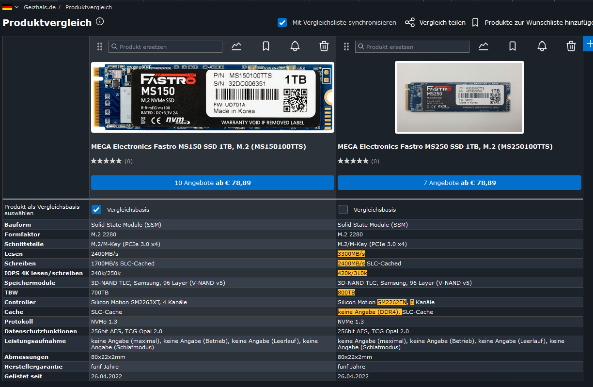 Eine MS250 mit 1 TB, die mit 3.300 statt 2.400 MB/s deutlich schneller ist als die MS150 mit gleicher Größe, gibt's auch noch - zum selben Preis von € 78,89 bei MF!