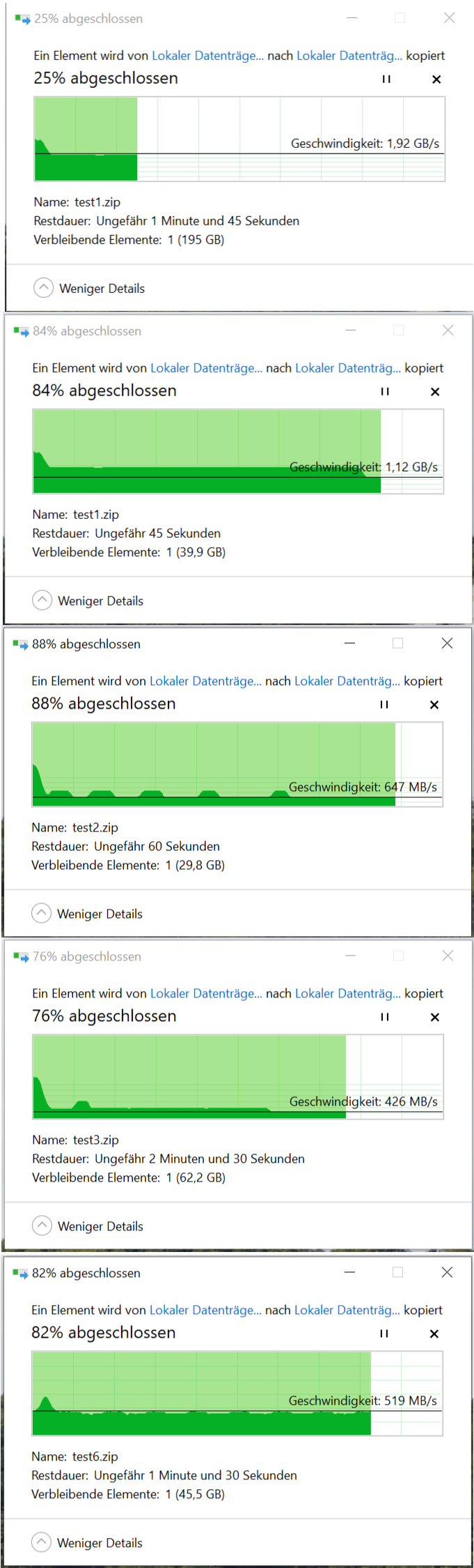 - Während des Kopiervorgangs der vierten Datei (test3.zip) ist die Schreibrate, nach insgesamt geschriebenen ~960GB, auf ~430MB/s runtergegangen. Dies war das Minimum, das bei meinen Tests aufgetreten ist.