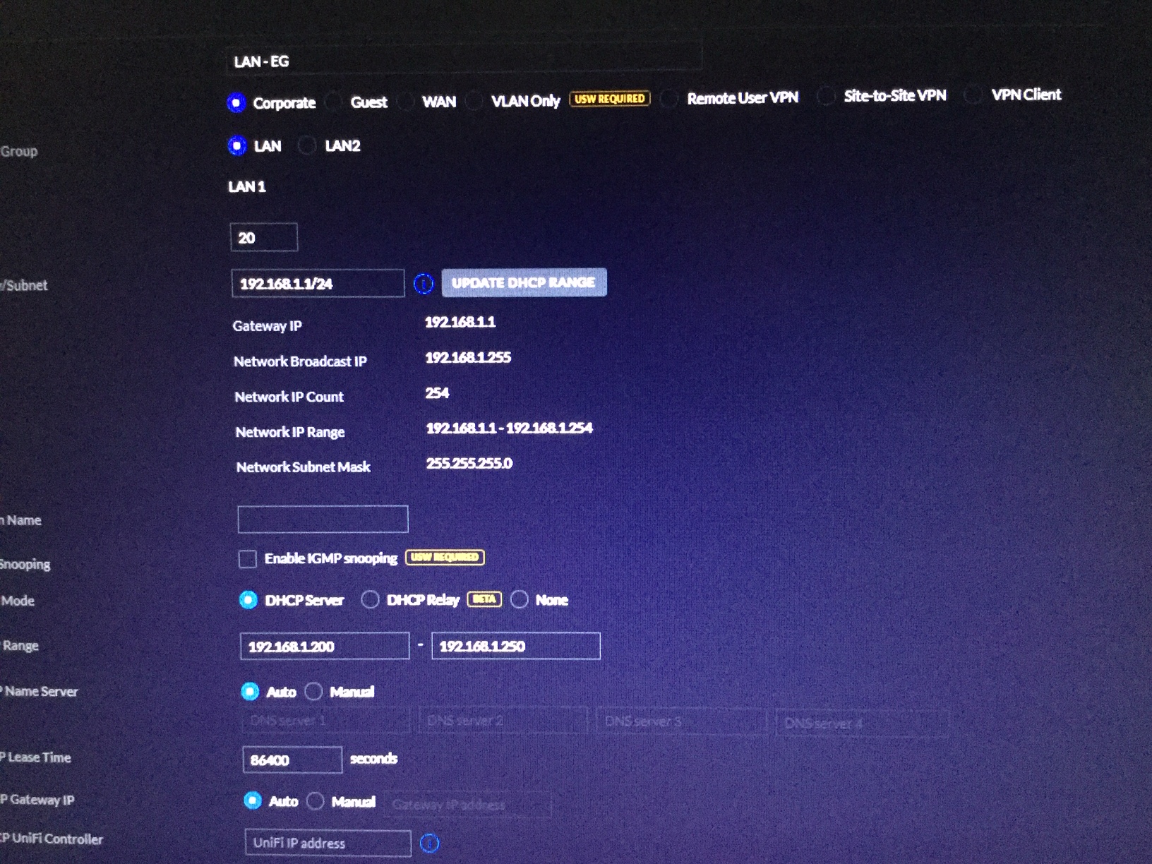 In den Einstellungen musst du ein Netzwerk anlegen, das auf LAN oder LAN2 läuft. Dort stellst du DHCP etc. ein.