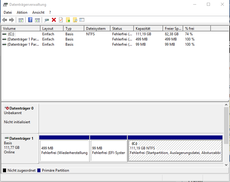 Habe gestern meinen Gaming PC zuammen gebaut und leider wird meine Seagate Firecuda nicht erkannt. Laut Datenträgerverwaltung (siehe Screen) wird mir ein Datenträger 0 angezeigt. Ich vermute mal, dass das die SSHD sein sollte da ich sonst keine anderen Laufwerke installiert habe.