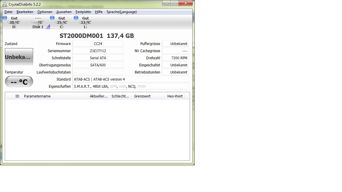 mit der ChristalDiskInfo Software wird die Platte mit 137,4GB angezeigt, es werden aber Puffergrösse, Betriebsstunden, ID und Parametername nicht angezeigt Platte ist als unbekannt deklariert. Firmware, Drehzahl, Serienummer etc. werden angezeigt.