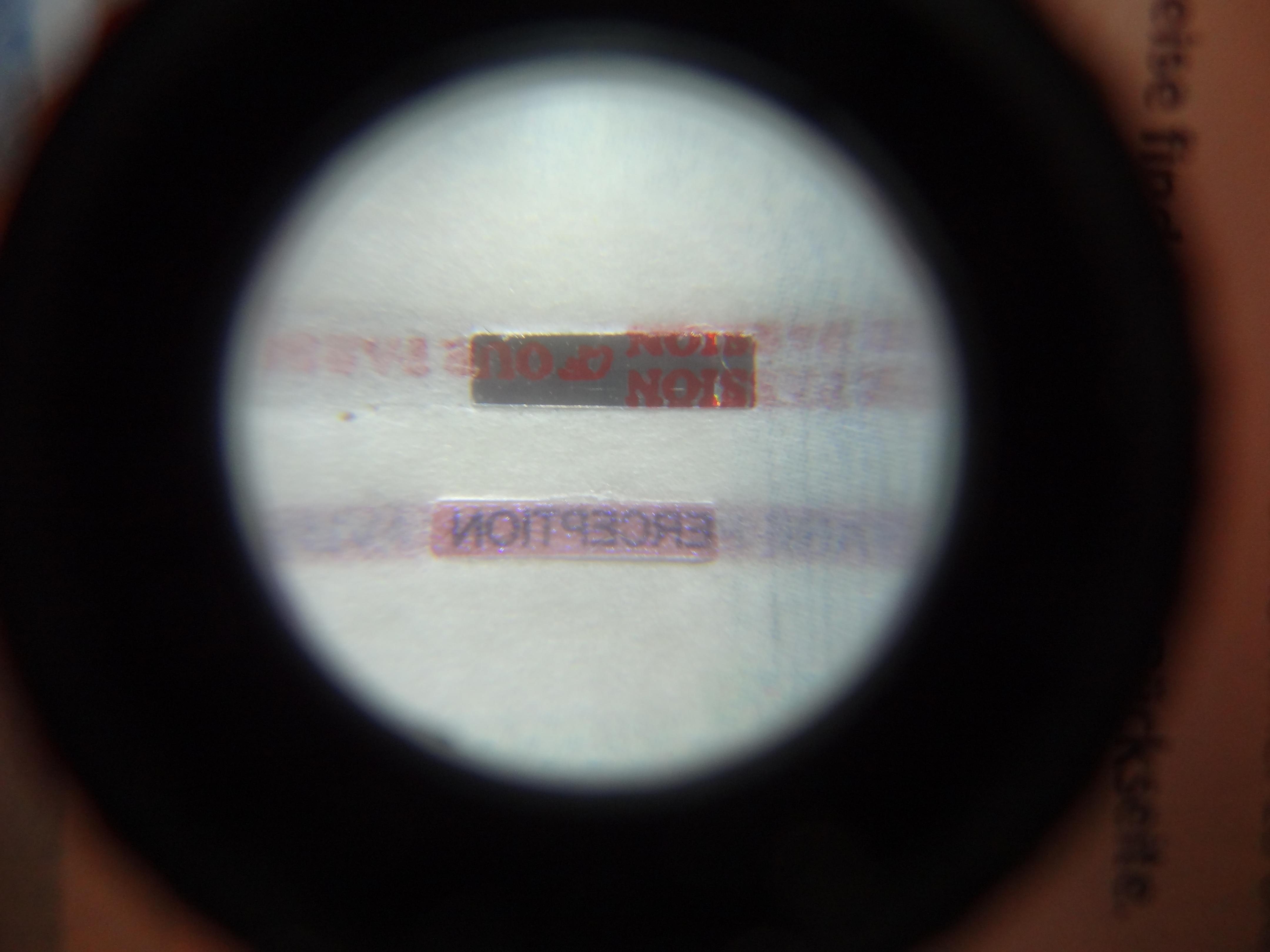 Damit weist mein Aufkleber ein Sicherheitsmerkmal auf das es als Original identifiziert, auf der anderen Seite fehlt aber die Mikroschrift.