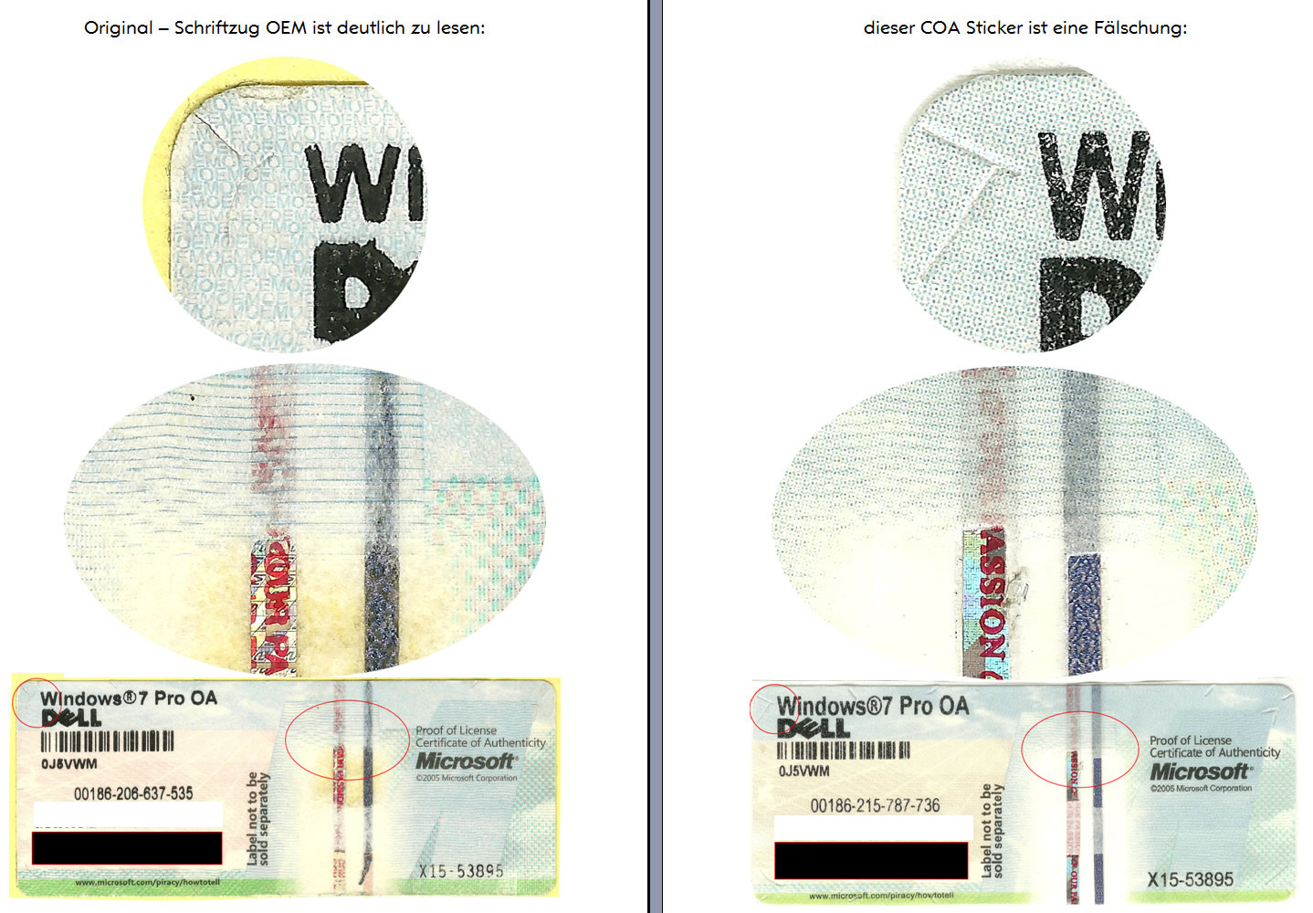 Hier ein Original Key und einer von PCFritz (Fotos nicht von mir) demnach habe ich wie erwartet auch Fälschungen bekommen.....