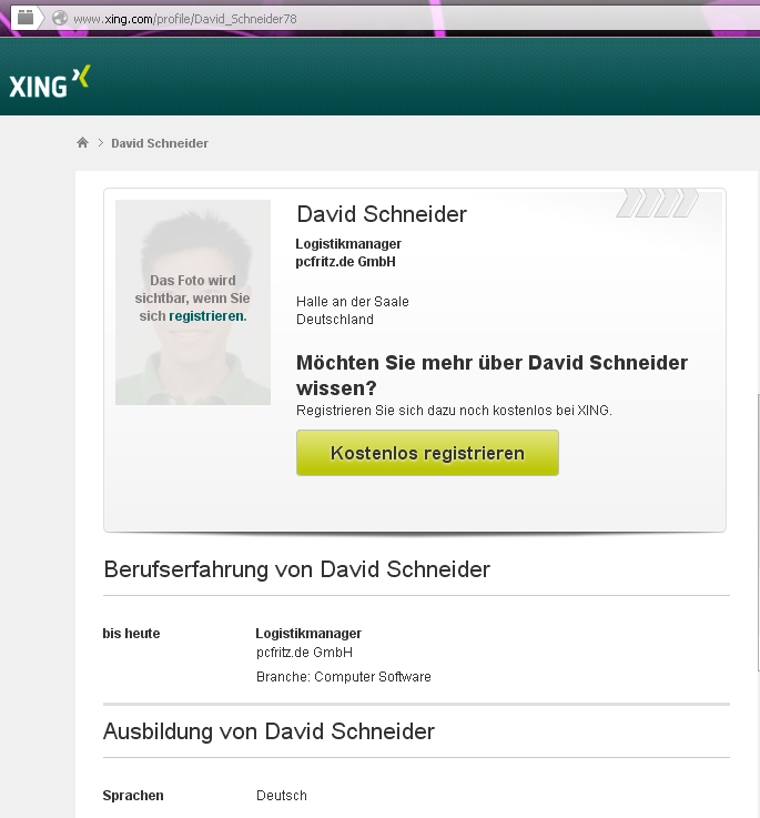 David Schneider hatte ich hier schon mal erwähnt. Kannst du bitte einen Screenshot der XING Seite zeigen? Details sind nur für registrierte Mitglieder sichtbar.