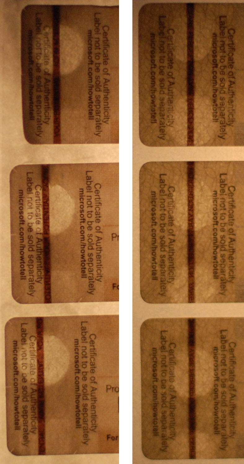 Der fluoreszierender Hintergrund ist auf dem Original und der Fälschung vorhanden, leuchtet unter UV Licht bei der Fälschung etwas heller. Die Schrift Microsoft und das ® sind beim Original sauber ausgeführt.