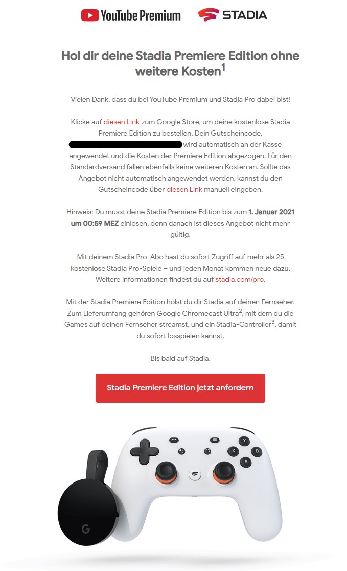 grade folgendes Angebot erhalten, weil ich YouTube Premium und einen kostenlosen Stadia account habe. Einfach mal YouTube / YouTube Musik aufmachen und dann sollte die Werbung erscheinen.