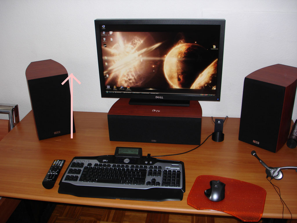 Die Boxen stehen derzeit provisorisch, aber wie auf den Bildern zu erkennen, alles andere als optimal, da ich derzeit noch keine Lösung gefunden habe. Für einen optimalen Klang sollten die Boxen (bzw. Hoch/Tieftöner?) auf Ohrhöhe sein, was sie aber wie auf den Bildern zu erkennen, nicht sind.