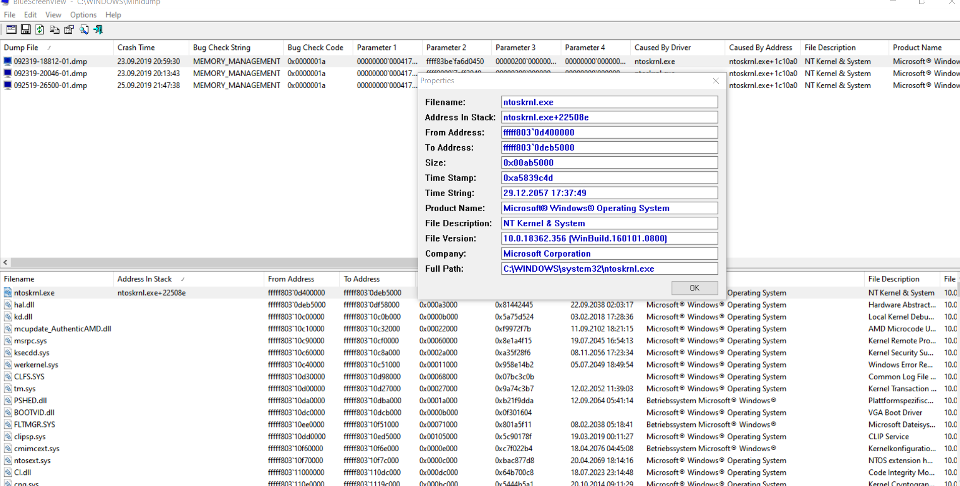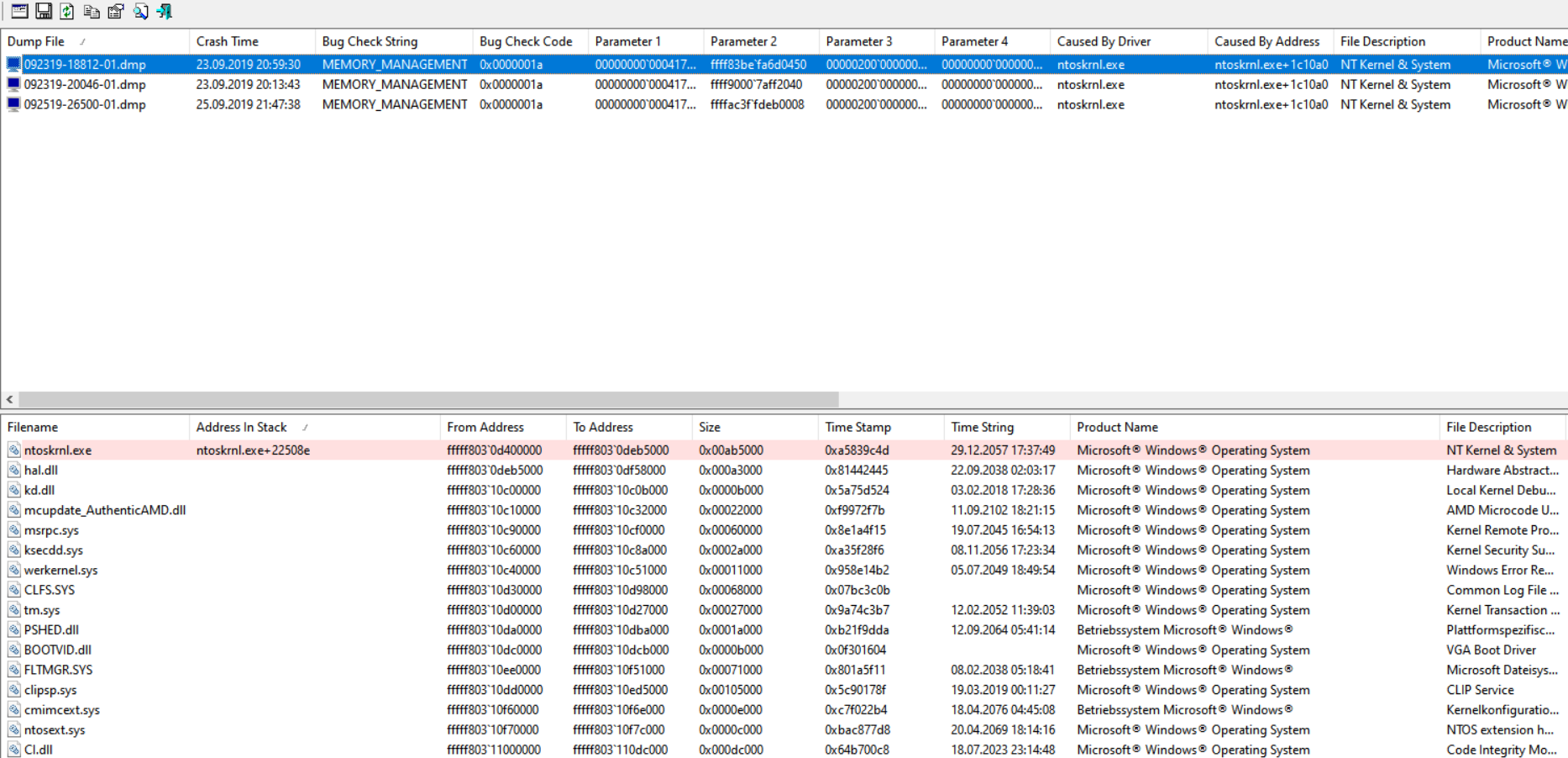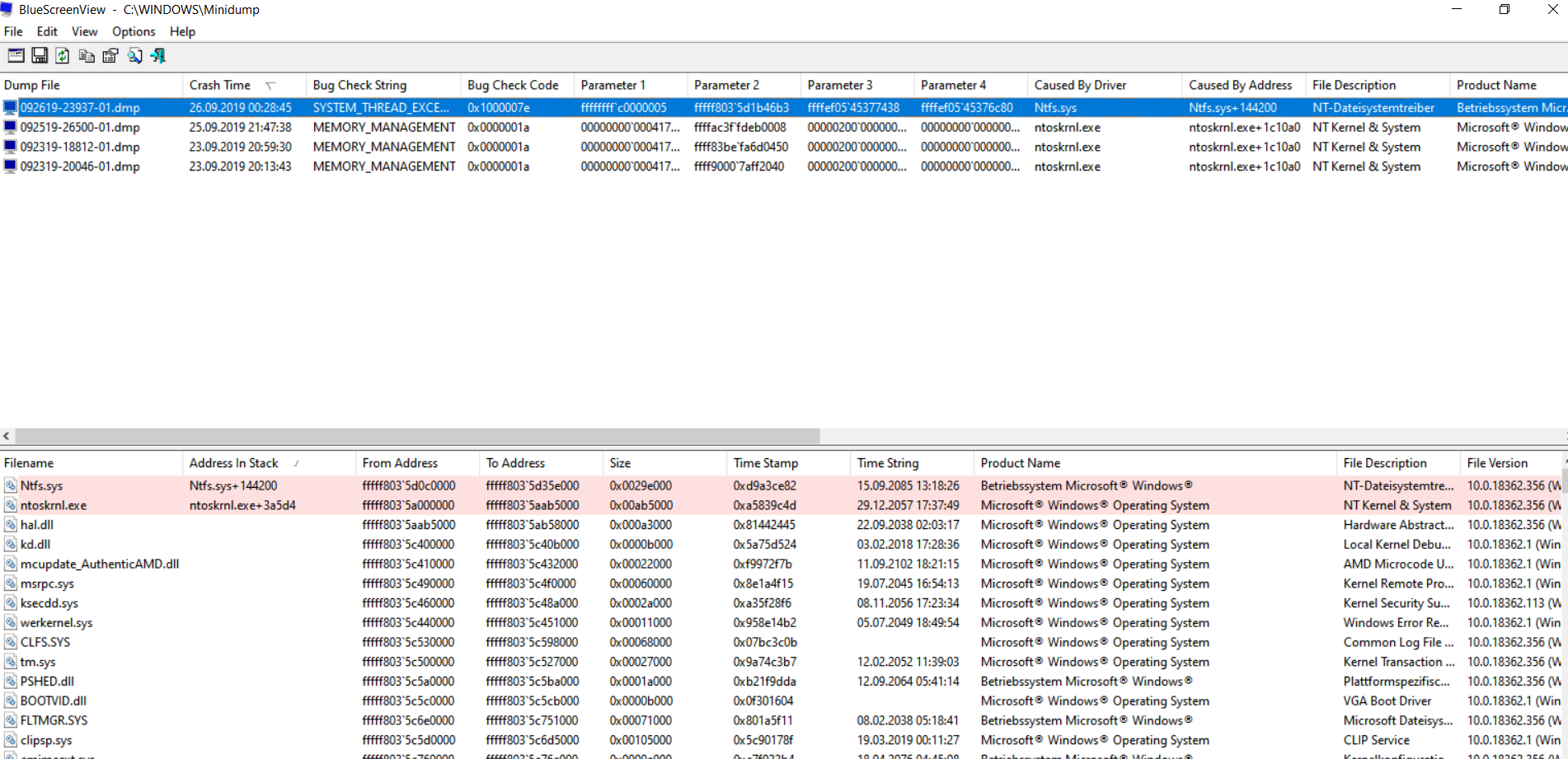 - BlueScreenView zeigt, dass die ntoskrnl.exe+ 22508e das Problem ist (siehe Anhang)