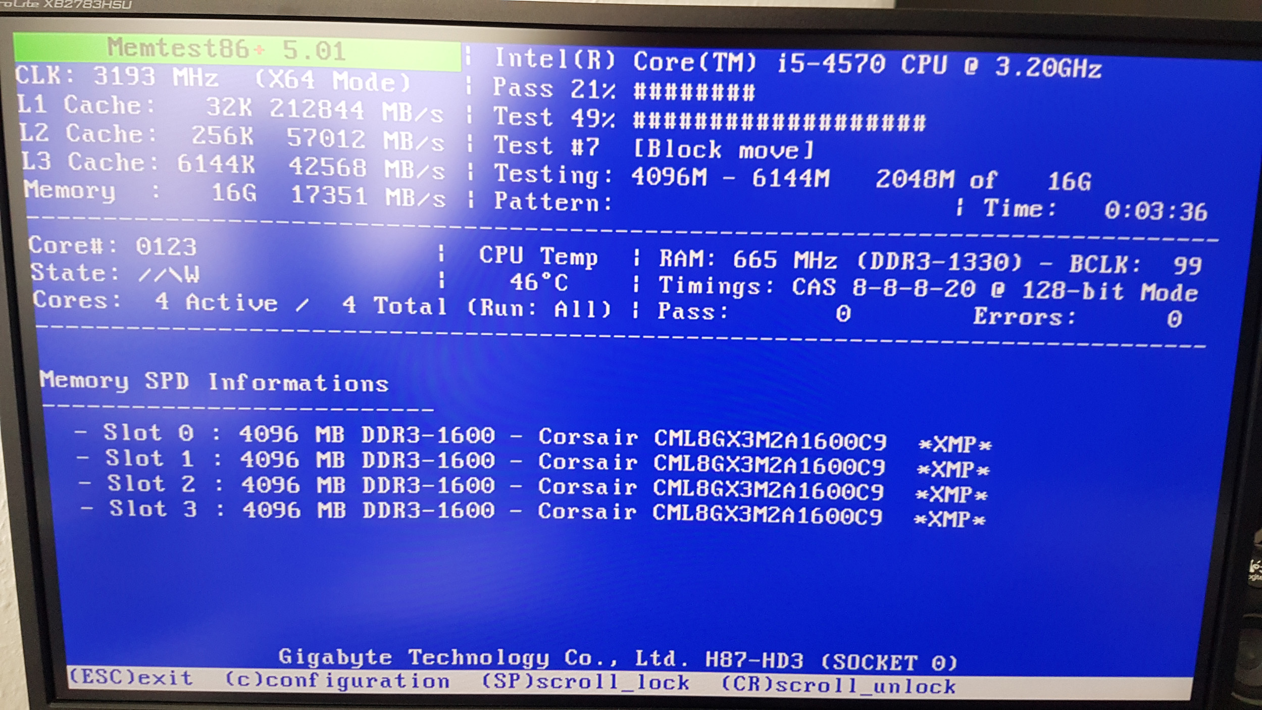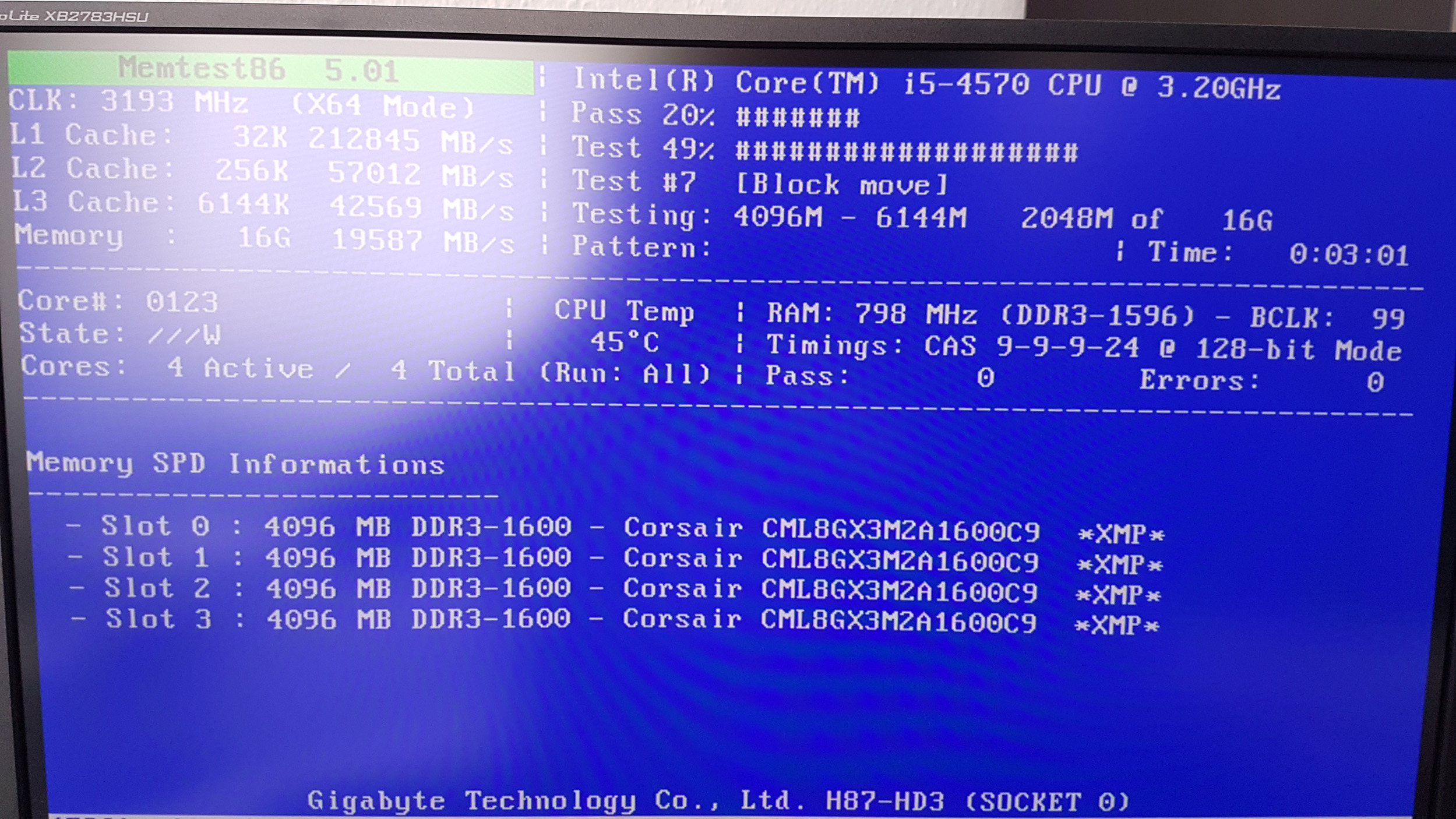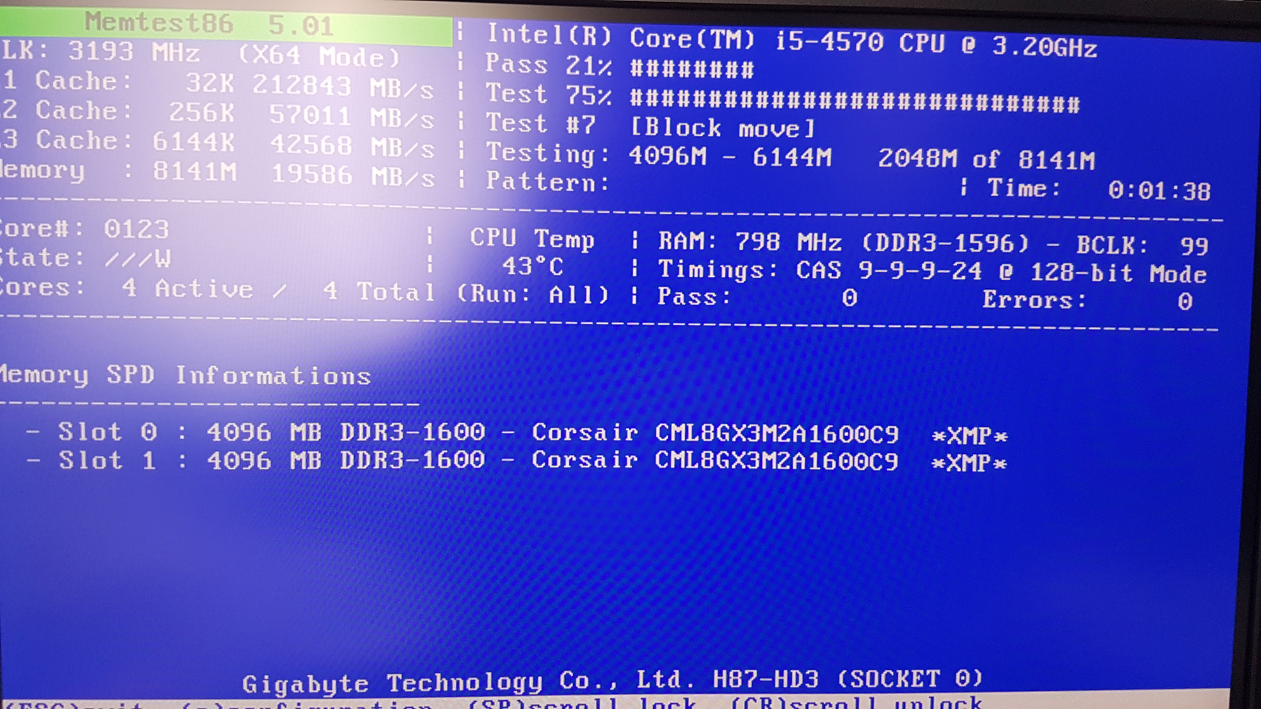 Zum Speichertest: 4 Stunden sind etwas knapp, eigentlich sollte ein Durchlauf reichen, zur Sicherheit kann man aber 3 laufen lassen. Hier einfach über Nacht rennen lassen. Memtest86+