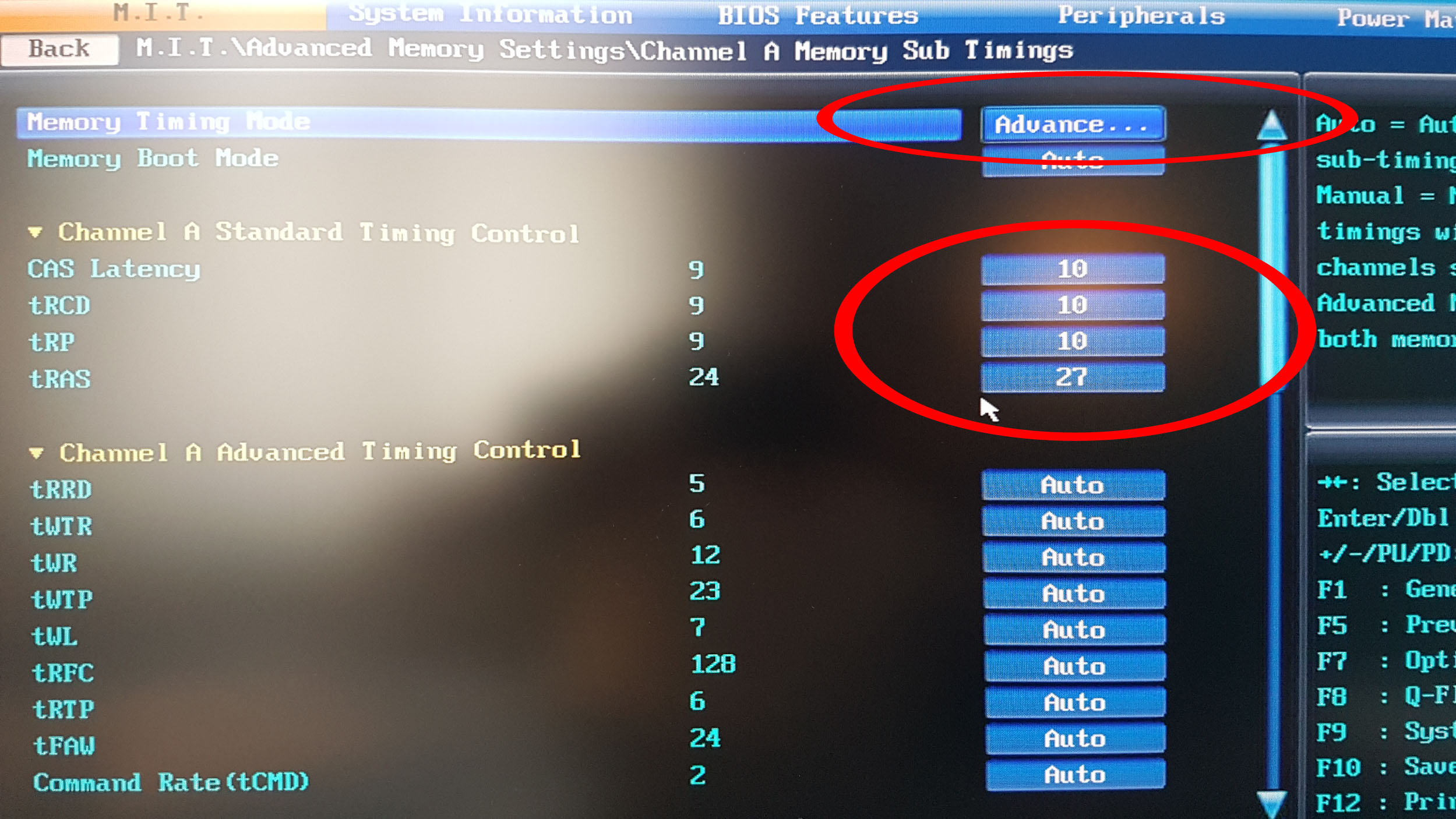 Dann sollte er nach Speichern und Neustart einen System Memory Multiplier von 16 wählen (automatisch). Die Timings sind für 9-9-9-24-33 spezifiziert. Ggf mal entwas entschärfen: 10-10-10-27 und testen.