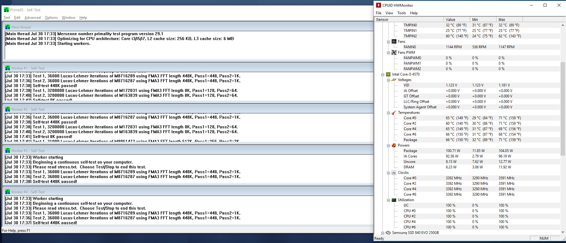 Dann habe ich Prime95 15 Minuten lang durchlaufen lassen. Die Gehäusekühlung habe ich auf Minimum. Aber so sehr beanspruche ich ja auch nie: