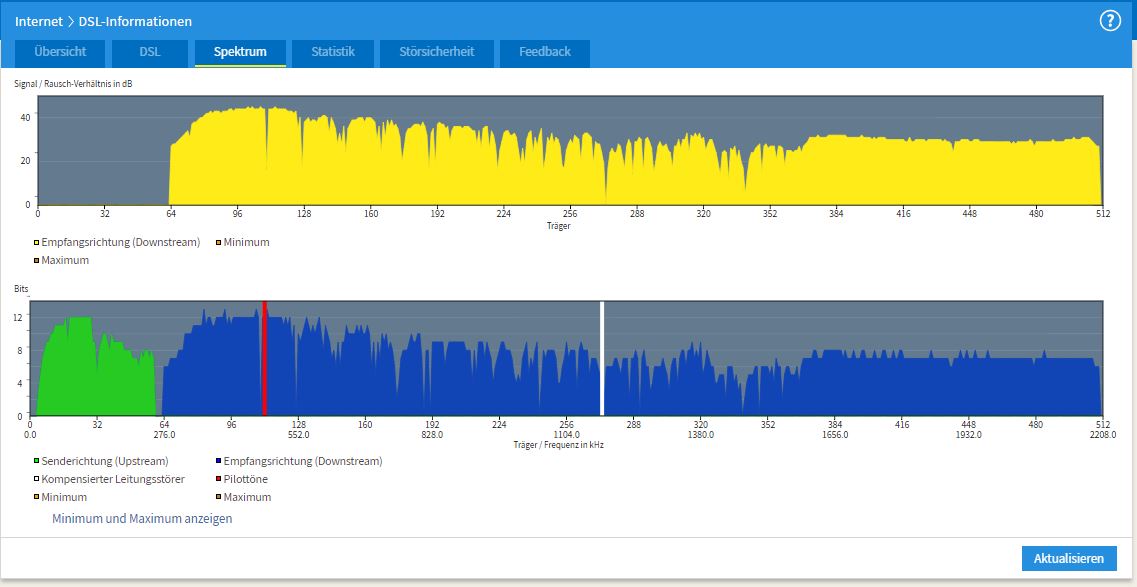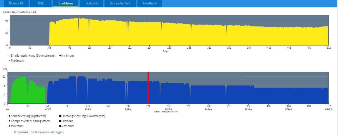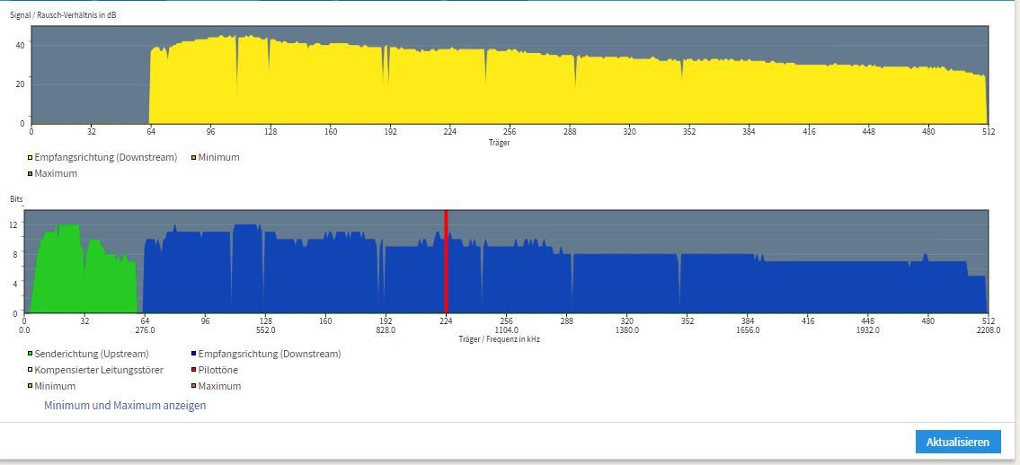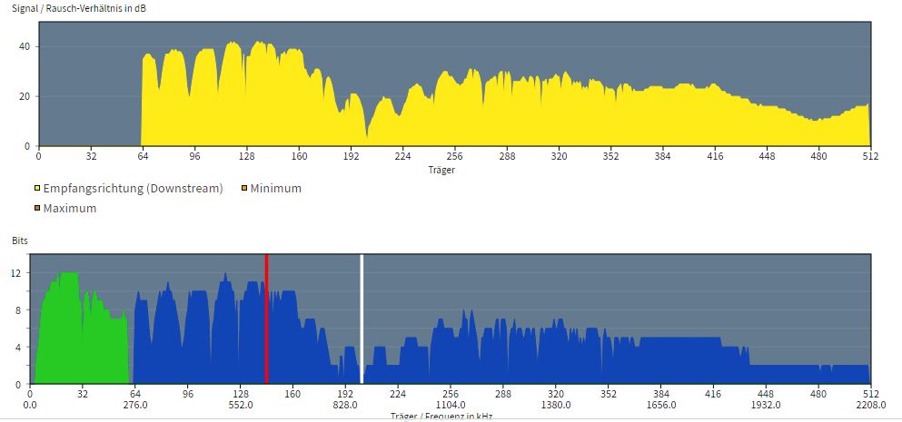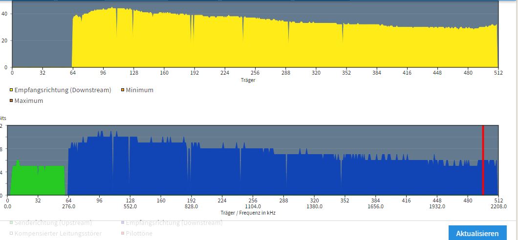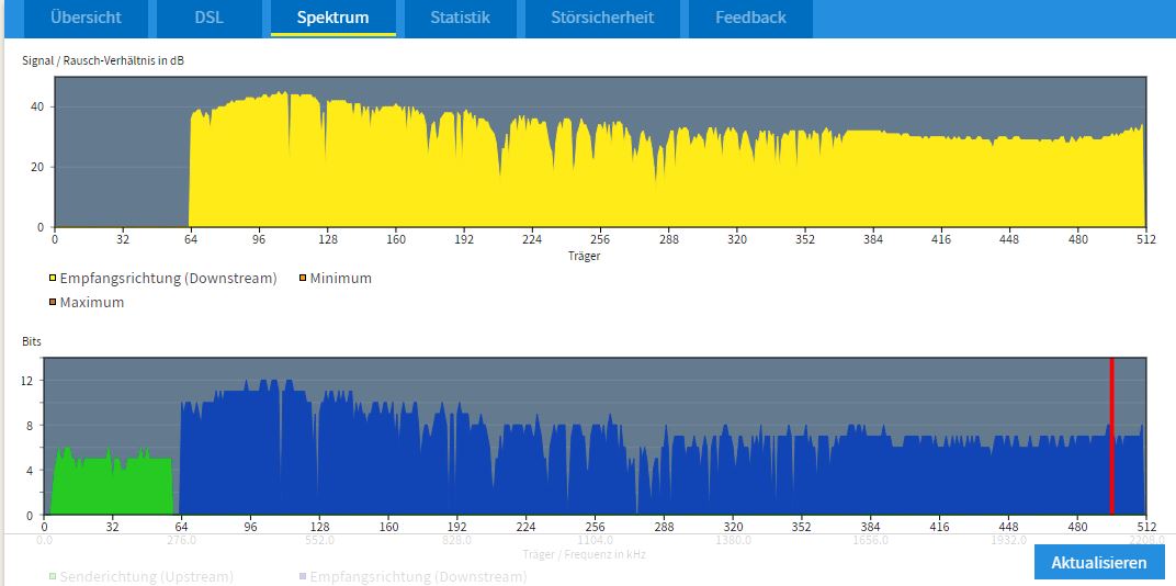 Die Synchro da in der Mitte vom Spektrum schaut recht ungesund aus, das Auf und Ab. Die Techniker checken auch nur bis zur TAE-Dose, dahinter ist deine Verantwortung. Störsicherheit in der FB etwas absenken, mal alle Kabel ziehen wieder anstecken und FB durchstarten. Falls das nichts bringt, ggf. erstmal neue Kabel besorgen, vielleicht hat eines eine Macke. Ansonsten ist es ggf. die FB selber.