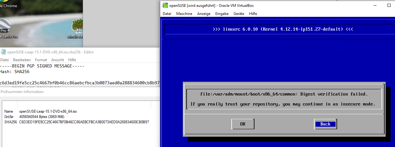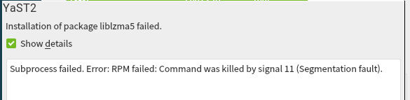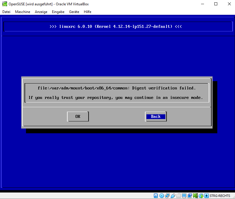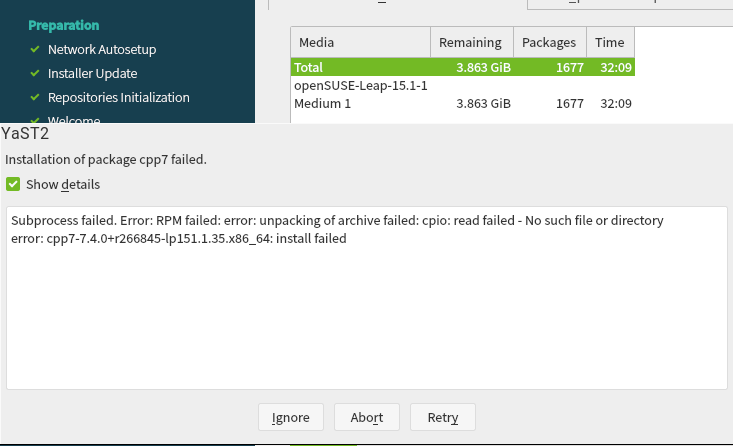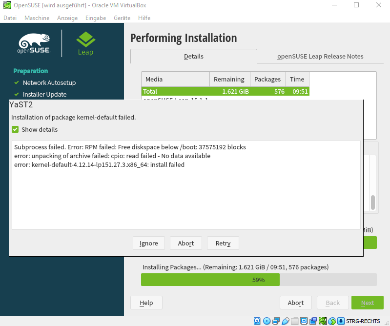Nachdem eine Installation von Leap 15.1 unter Hyper-V problemlos durchlief, bekomme ich bei VirtualBox ständig Fehler - Anfangs kam 2x "Subprocess faile. Error: RM failed: Command was killed by signal 11 (Segmentation fault)." (dort hilft nur "Ingore") kommt im weiteren Verlauf ständig "Subprocess failed. Error: RPM failed: error: unpacking of archive failed: cpo: read failed - No such file or directory" - hier hiflt dann "Retry".