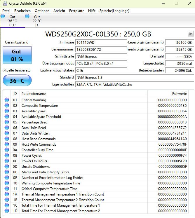 - HDD / SSD: M.2 Western Digital WDS250G2X0C-00L350 und HDD Toshiba HDWD110
