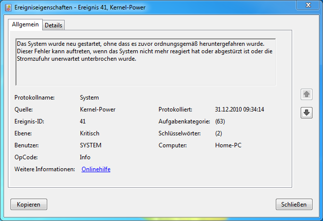 In der Ereignisanzeige zeigt er mir Kernel Power Ereignis-ID 41 Aufgabenkategorie 63.