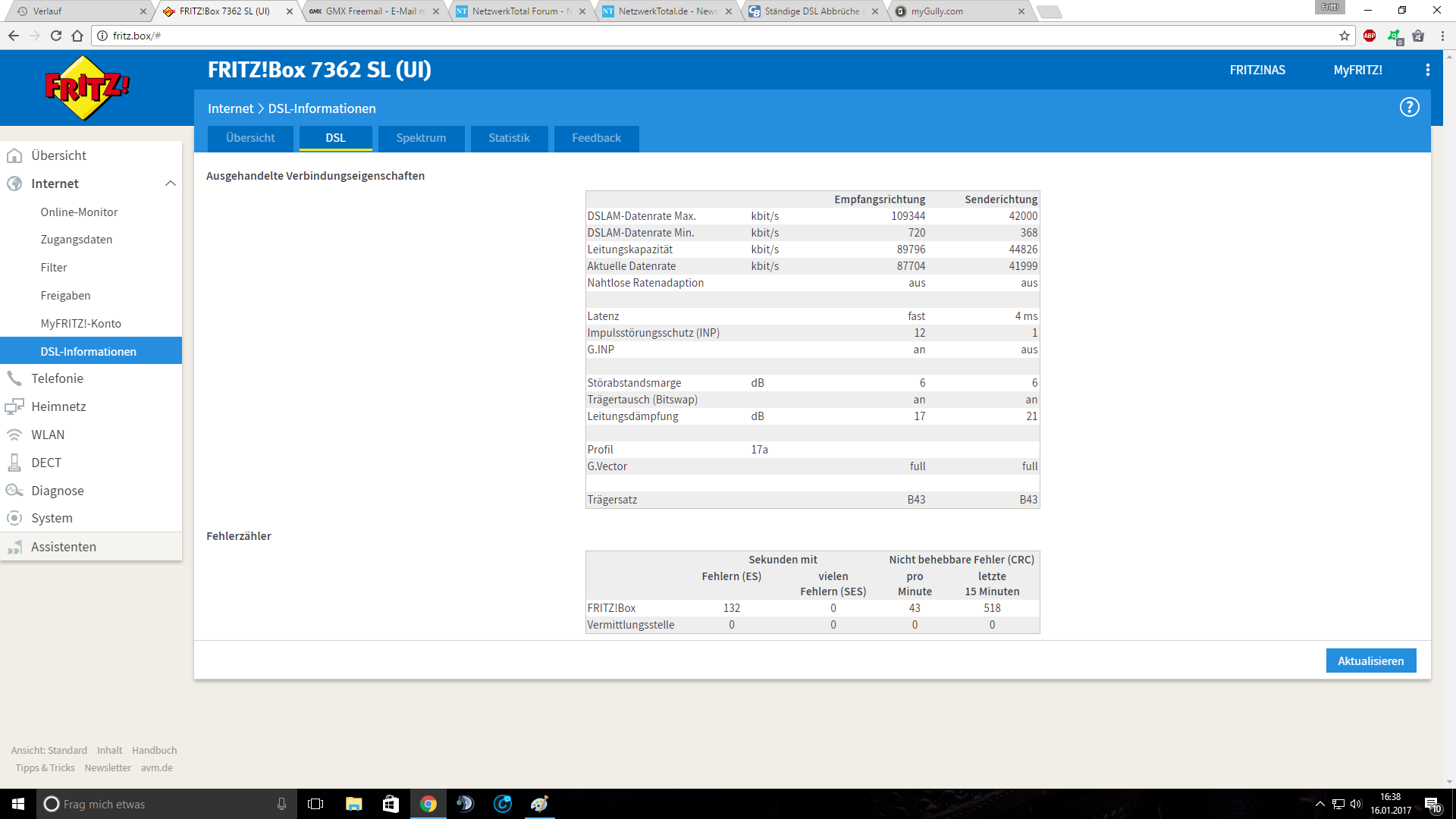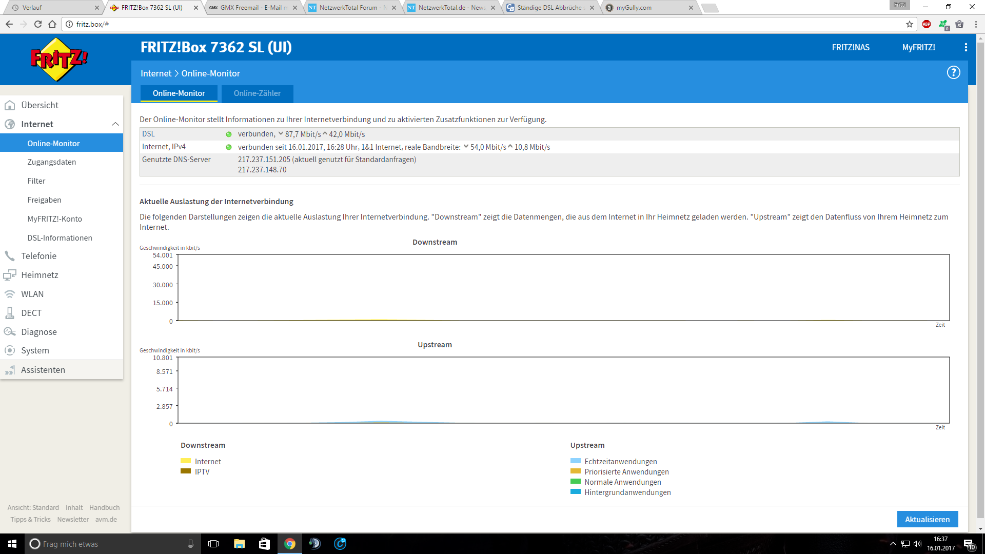 Die Abbrüche treten gelegentlich "nur" alle 2 Stunden auf oder es läuft auch mal einen ganzen Tag ohne Probleme aber meistens habe ich in unregelmäßigen Abständen viele Abbrüche in kurzer Zeit. Die Verbindung bricht aber spätestens beim Download größerer Dateien ab. Sei es ein 2GB Update für ein Spiel oder Sonstiges.