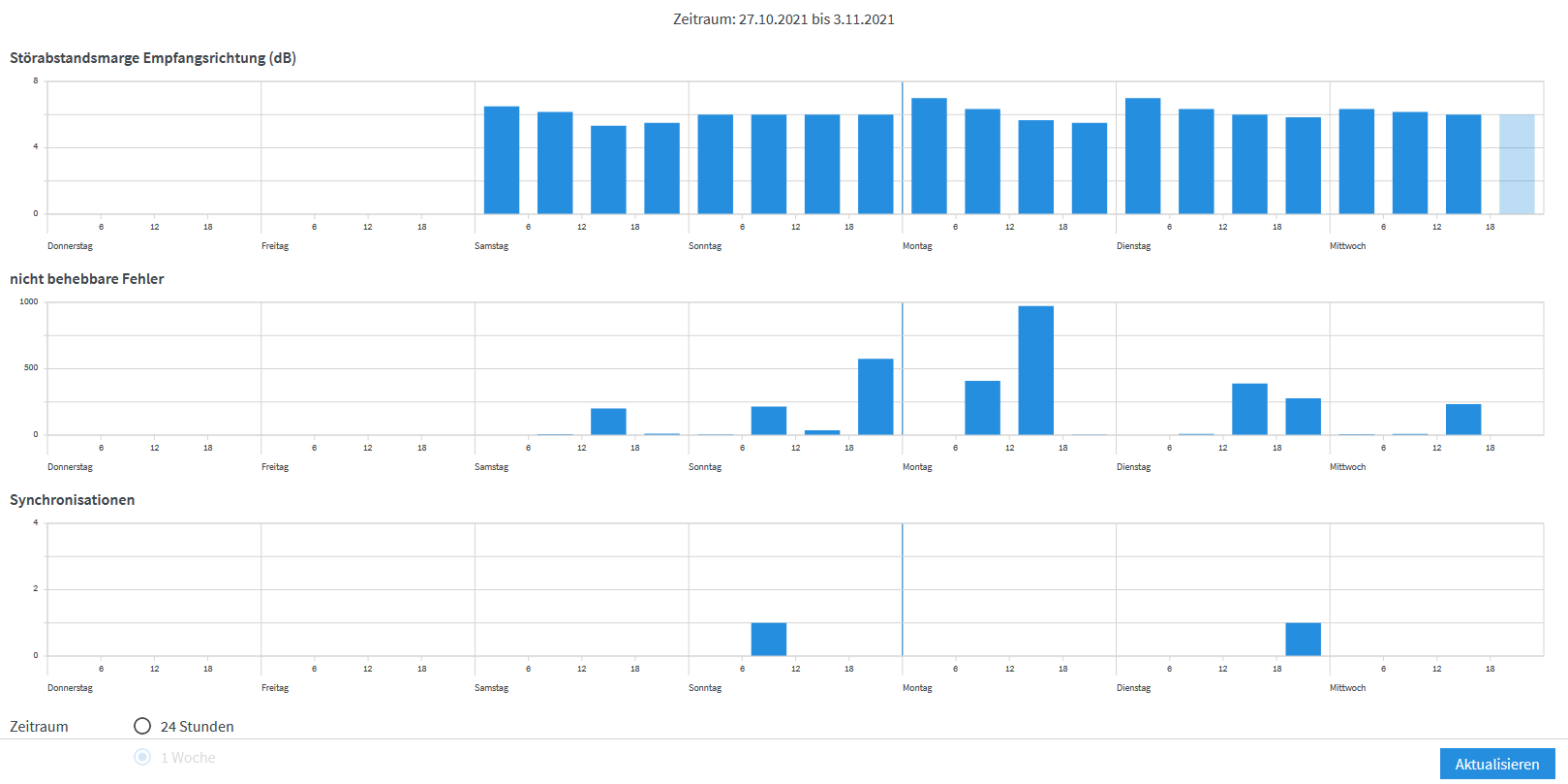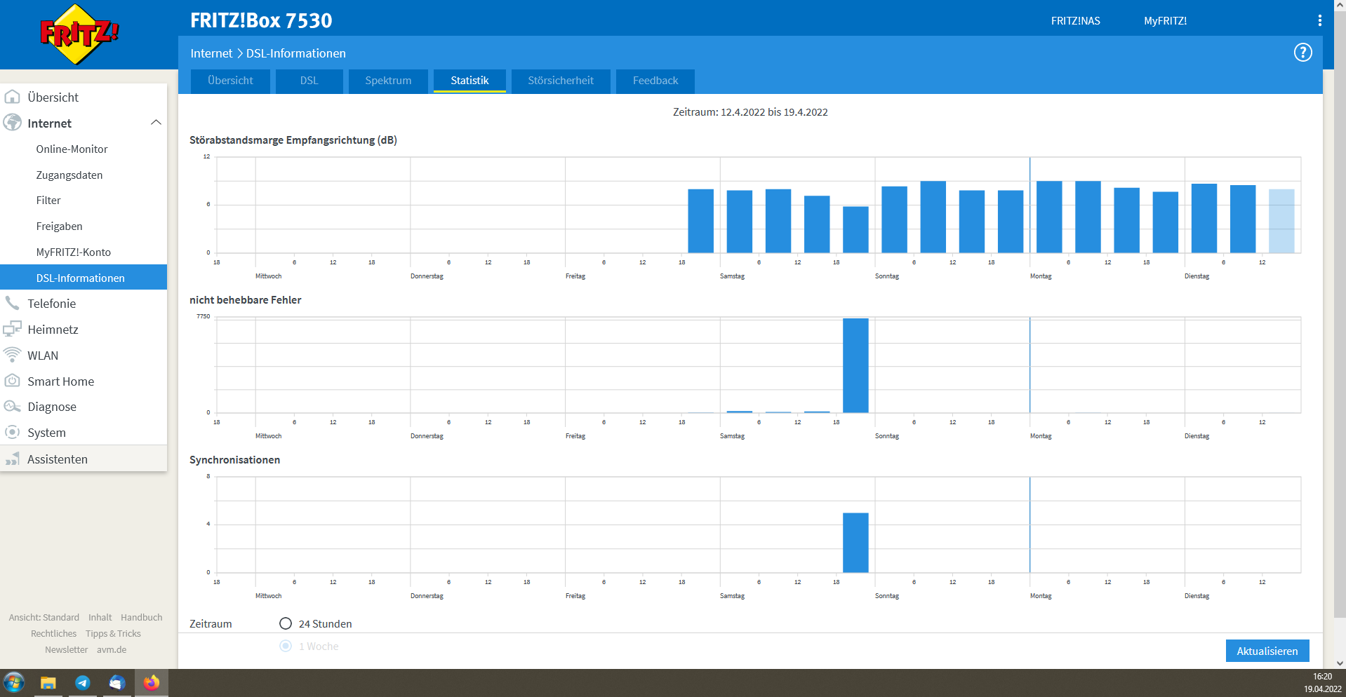 Laut Vodafone liegt jedoch kein Problem an der Leitung vor, bzw. will man sich nicht mit diesem Problem befassen, denn diese Ausfälle sind sehr unregelmäßig (und ich habe immer das Glück, dass bei der Leitungsprüfung der Vodafone KEIN Ausfall vorliegt). Unregelmäßig in diesem Kontext bedeutet: 5-6 Mal innerhalb von 3 Stunden, dann wieder 2 Tage Ruhe, dann jeweils ein Ausfall morgens und spätnachmittags, dann wieder 8 Stück über den Tag verteilt, gefolgt von 2 Wochen ohne Ausfälle. Muster ist in diesen Ausfällen keines erkennbar, sprich. keine spezielle Uhrzeit, kein spezielles Wetter und auch der Vollmond scheint ausnahmsweise keine Rolle zu spielen... Lediglich die Menge der "nicht behebbaren Fehler" peakt vor solch einem Ausfall in die Höhe.