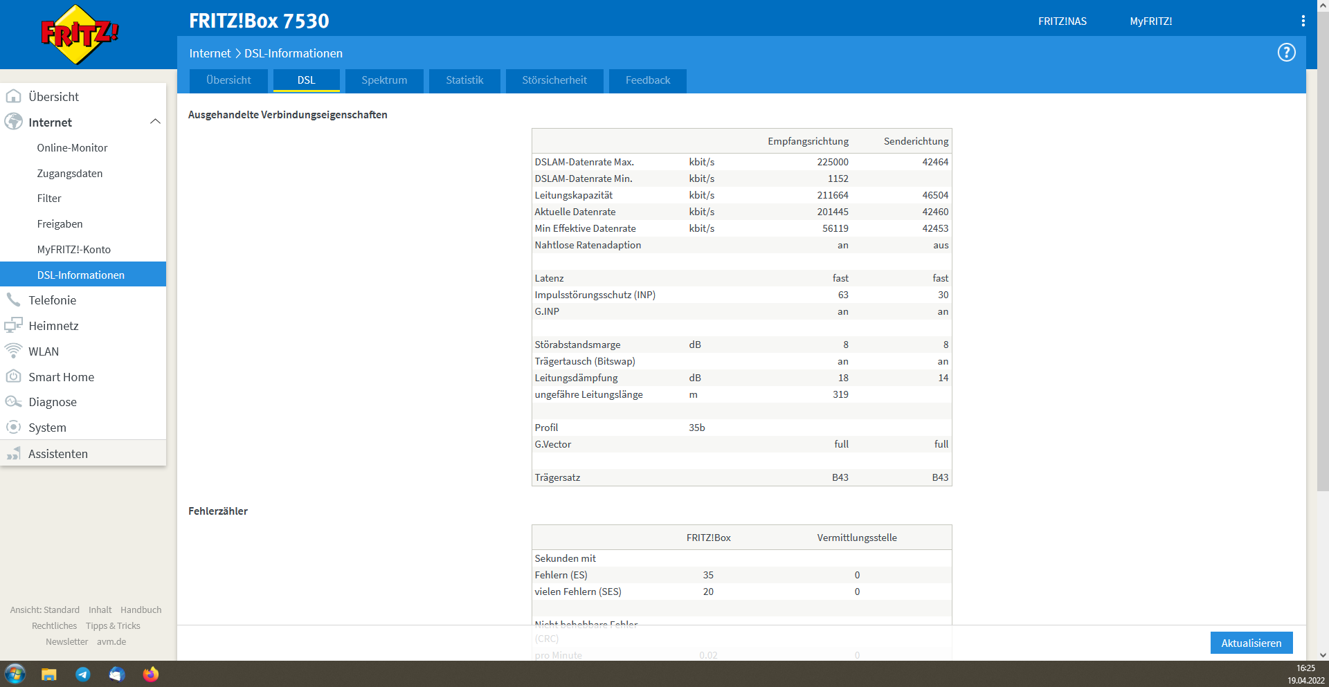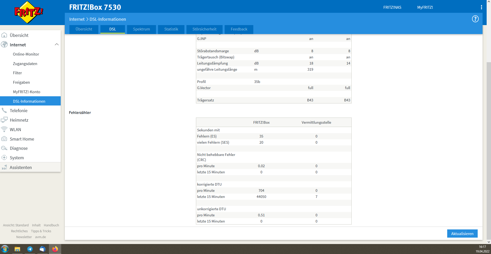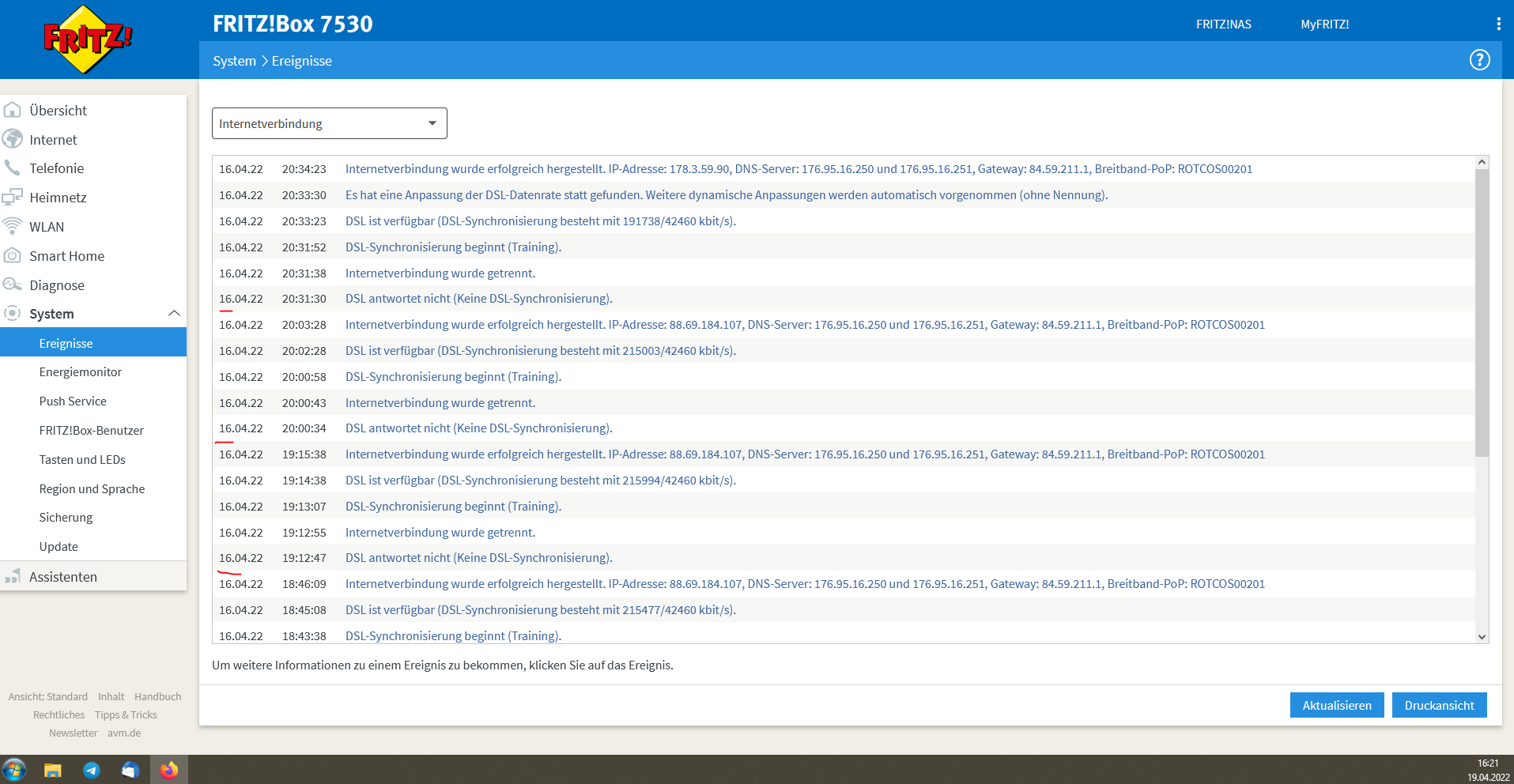 Seit Beginn des Anschlusses habe ich (un)regelmäßige Komplettausfälle des gesamten DSL-Anschlusses (Internet & Telefon). Begleitet werden diese Fehler von der Ereignismeldung "DSL antwortet nicht (keine DSL-Synchronisierung)." in der Fritzbox 7530 (dem Leihgerät der Vodafone), sowie einem erneuten Aushandeln der DSL-Verbindung. Dieses dauert dann ca. 5 Minuten und ich habe wieder Internet/Telefon.