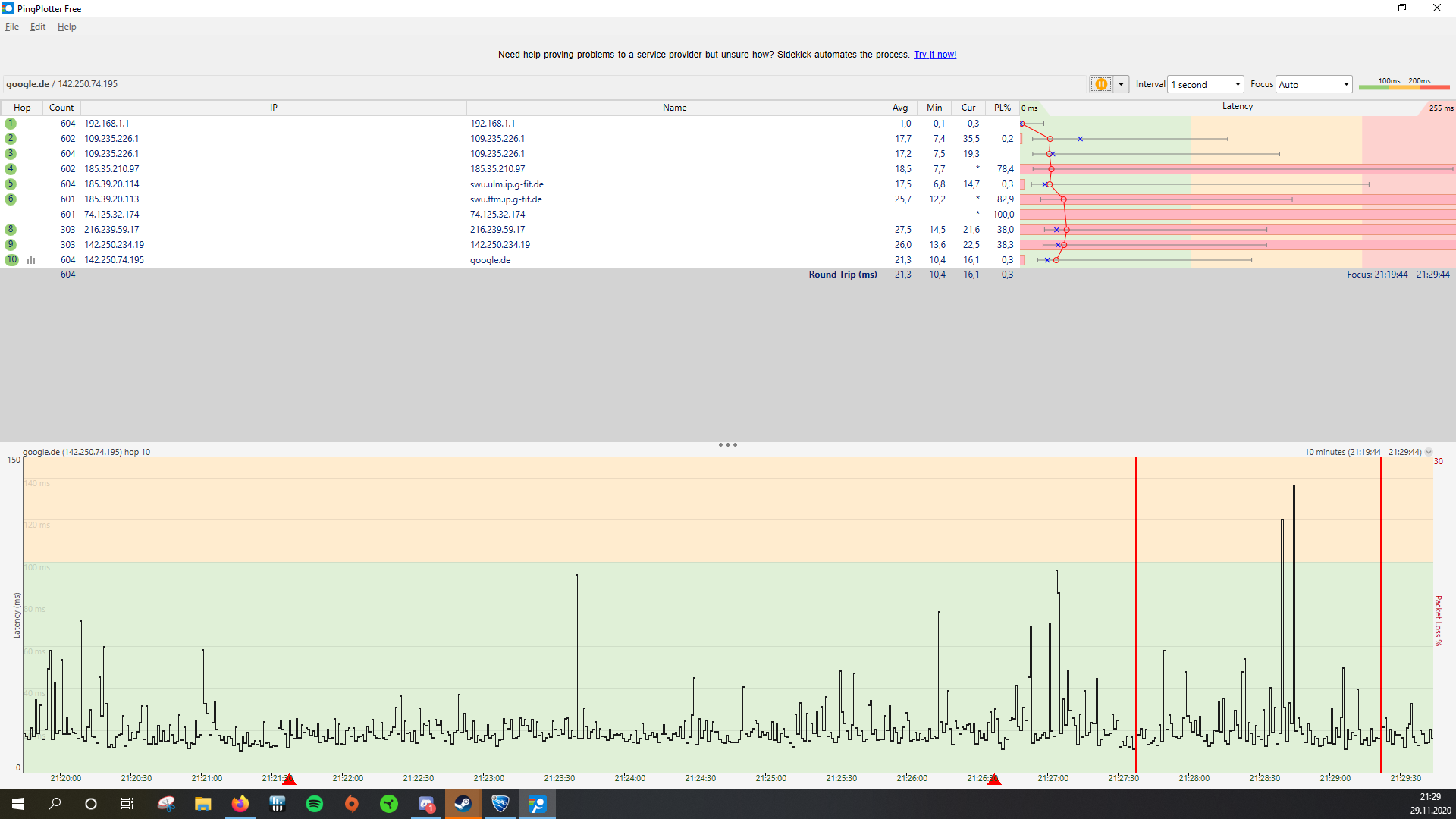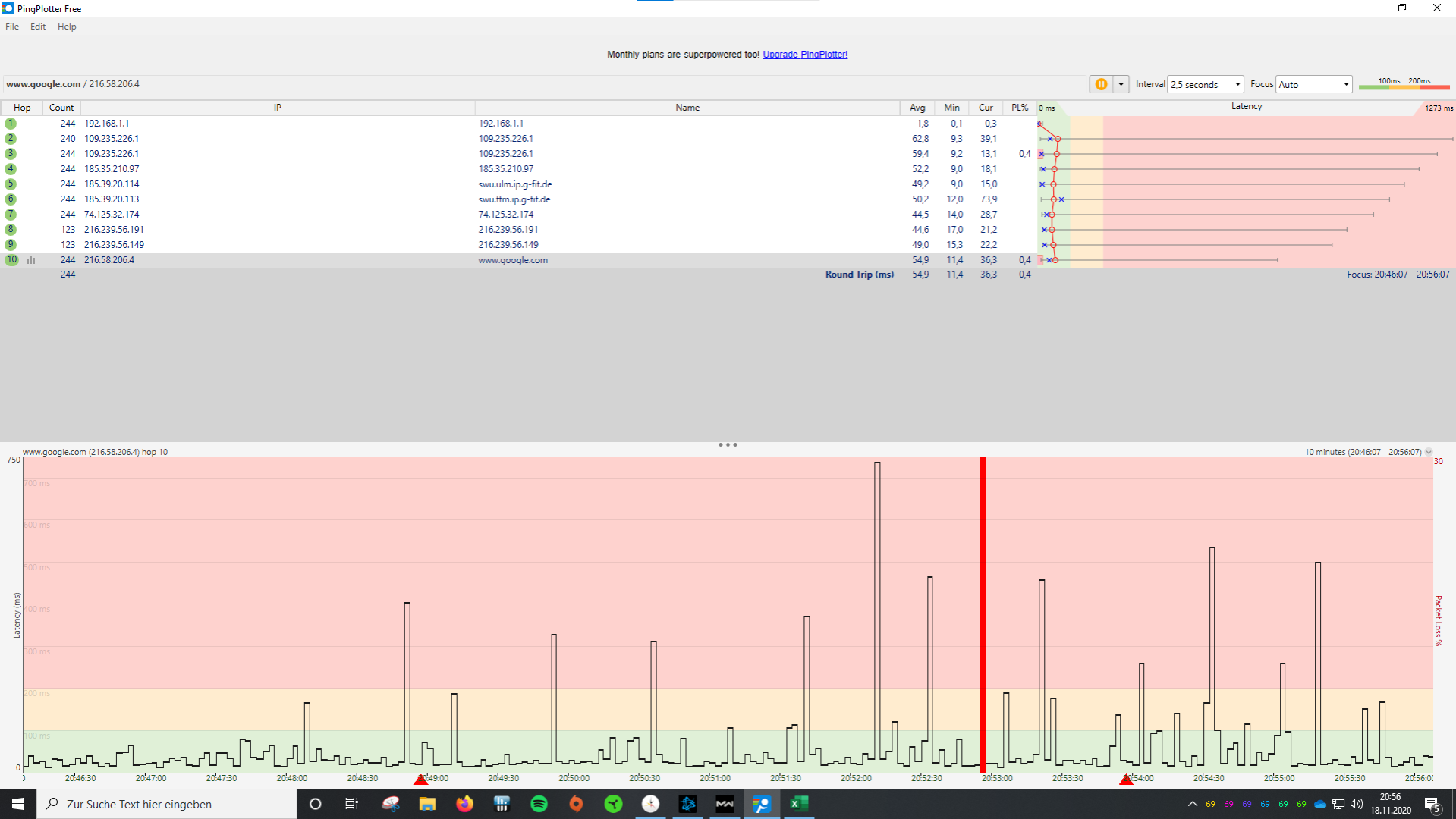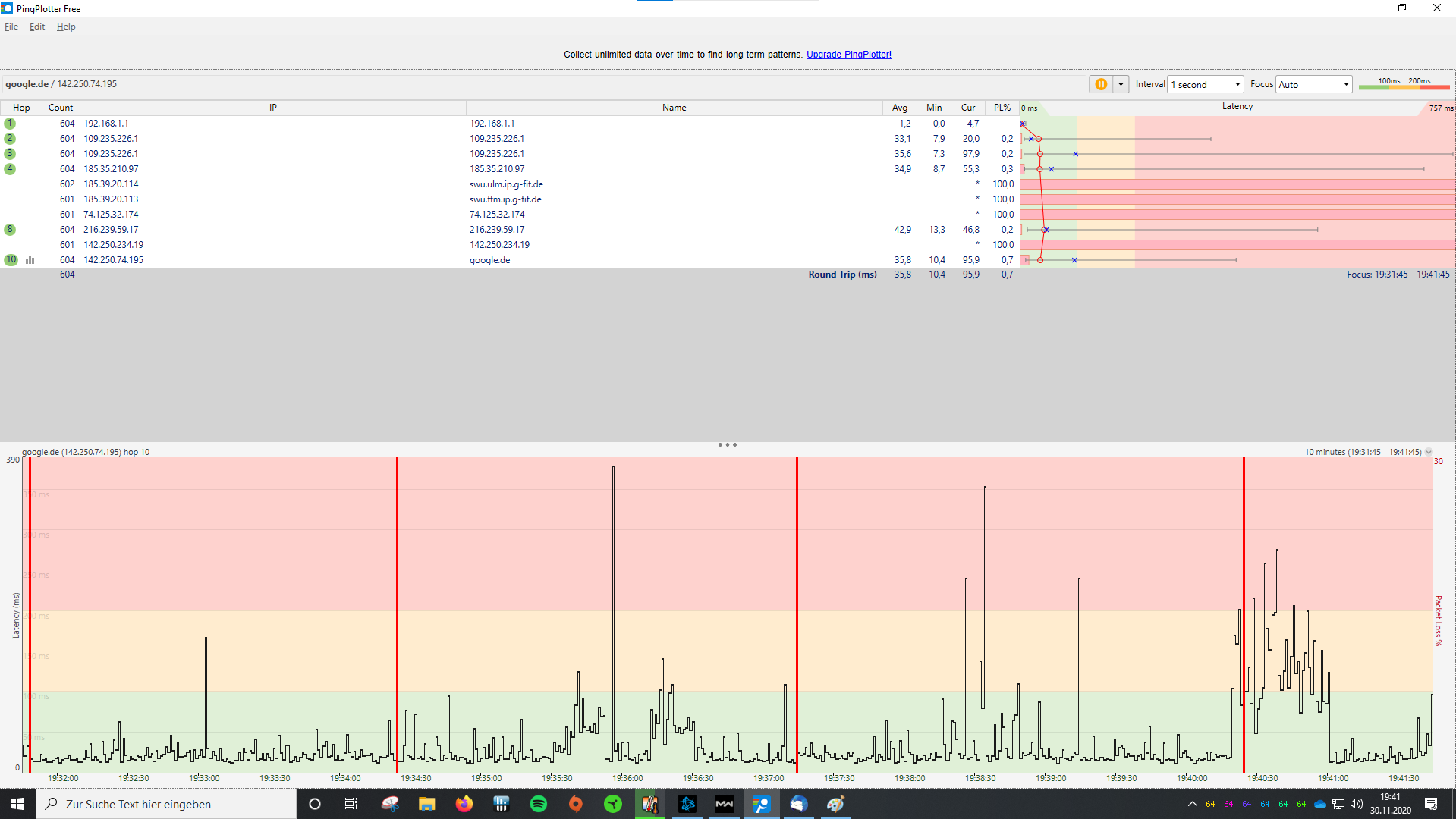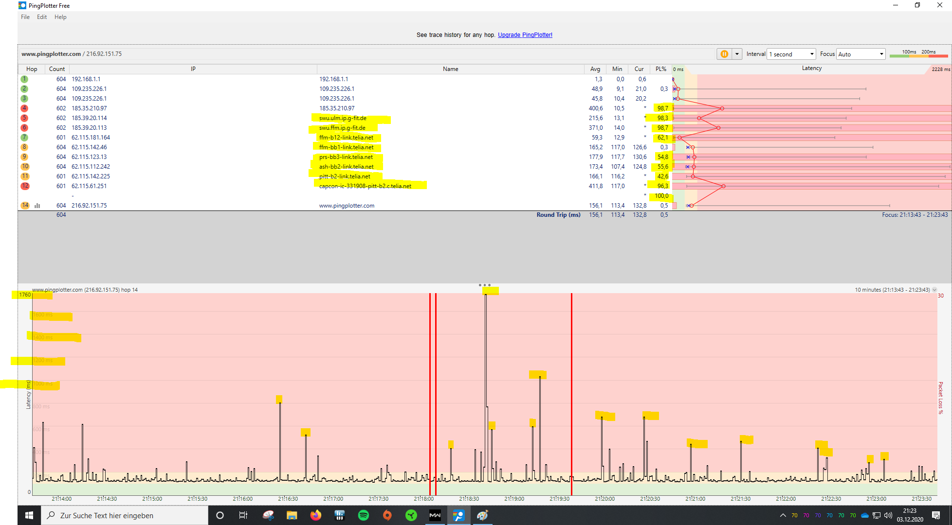 Anbei mal ein Screenshot von meinem PingPlotter Test: