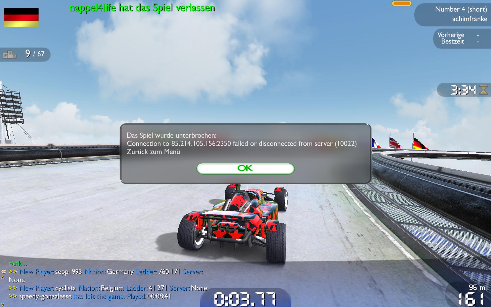 Seit dem ich TM Nations Forever wieder installiert hab, habe ich einen ständigen Disconnect vom Server. Mal kann ich ne halbe Stunde am Stück zocken und heute ist es besonders schlimm, da kann ich nicht mal für ne Minute zocken. Die Fehlermeldung habe ich angehängt und auch meine Netzwerkeinstellungen. Es ist egal auf welchem Server ich bin. Es passiert immer wieder. Das komische daran ist aber, dass ichj das Spiel schon mal vor nem Monat installiert hatte und ich da keine Probleme hatte mit Disconnects. Ich hoffe, ihr könnt mi helfen. Falls ihr noch irgendwelche Infos braucht, fragt einfach.