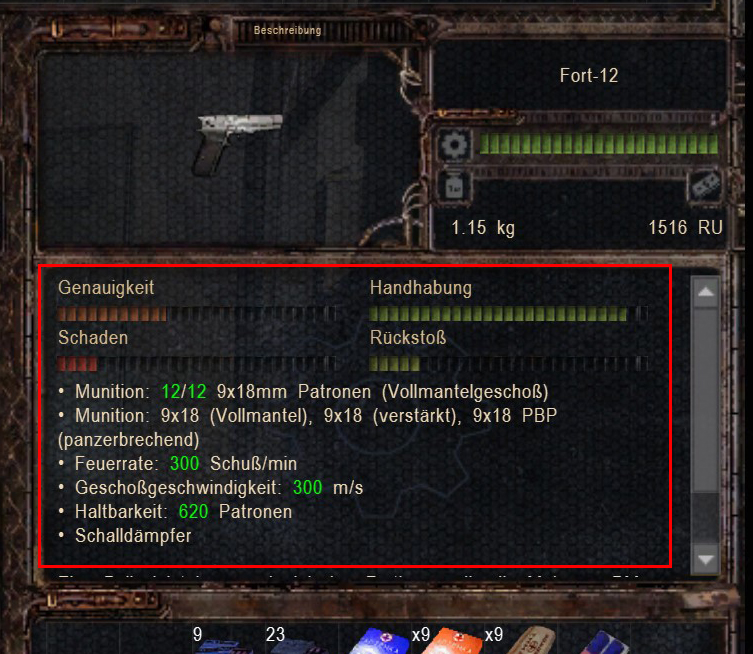 -Die Ausgabe der Parameter der Patronen (relativ zum Basisparameter der Waffe), z. B. „Varianz“, bedeutet 130%, 30% mehr als die Basisabweichung der Waffe, und 80% bedeuten eine Streuung um 20%. Zum leichteren Verständnis sind alle Merkmale farbig. Grün ist gut, Rot ist schlecht.