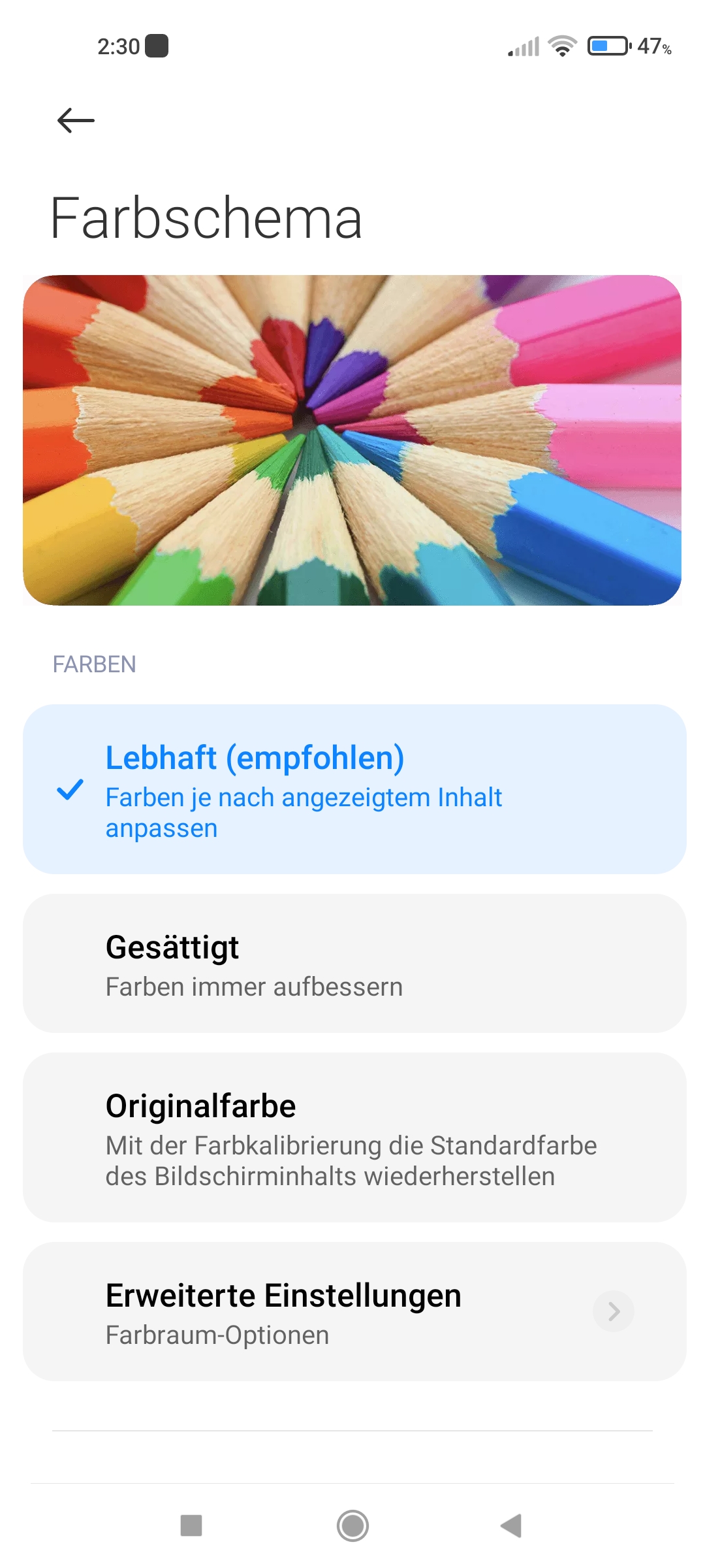 Apropos SRGB, das sieht mal richtig blass auf dem Telefon aus, während ich P3-Farbraum von der "Prallheit" vergleichen würde, vielleicht ein Mü mehr. Bei "Lebhaft" ähnlich, während "Gesättigt" vermutlich so eine Pfusch-Lösung ist, die die Farben noch praller macht, ohne noch mehr Farbraum, ähnlich wie die Farbsattingsregler im Monitor-OSD.