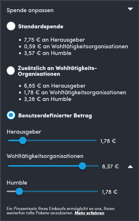 Kannst Dir diesbezüglich ja die anderen aktuellen Bundles bei Humble mal genauer anschauen. Auf der rechten Seite findet man da unter anderem "Spende anpassen" zum aufklappen und einstellen. Ich persönlich stelle es da immer so ein, dass Humble den Mindestanteil und der Publisher den gleichen Betrag wie Humble und die Wohltätigkeitsorganisationen somit den Löwenanteil erhalten, wie hier zum Beispiel beim Ultimate Racing Sim Bundle: