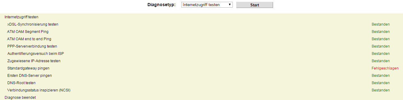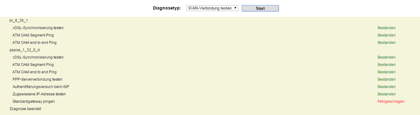 Nun habe ich aber entdeckt, dass bei Speedtests kein Pingwert ermittelt werden konnte. Daraufhin habe ich dann mal das Diagnosetool des Modemrouters angeworfen und erhielt folgende Ergebnisse: