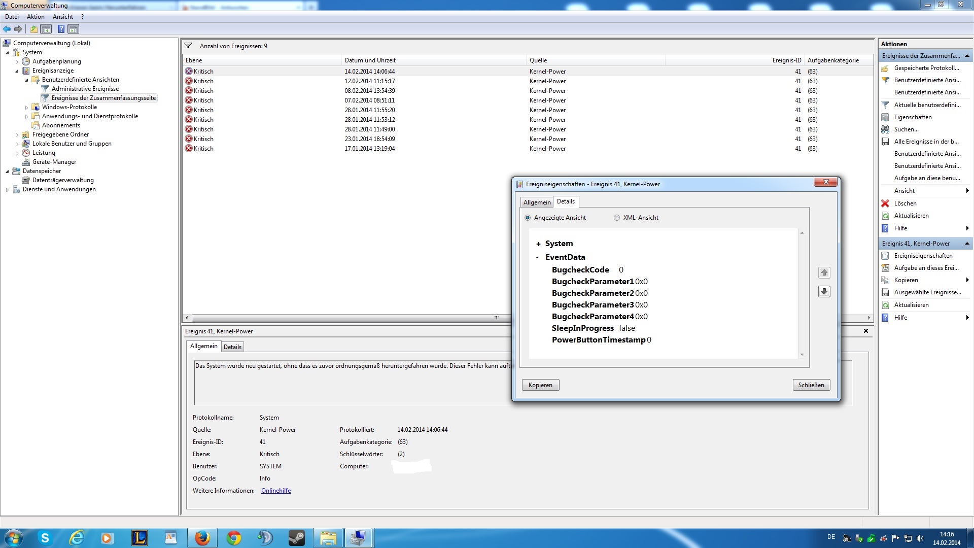 In dem ersten Bild ist nur die Zusammenfassung zu sehen. Dort sind nur die Abbruchcodes dargestellt. Die Fehler besagen nur, dass der PC neu gestartet wurde, ohne dass er vorher ordnungsgemäß heruntergefahren wurde.