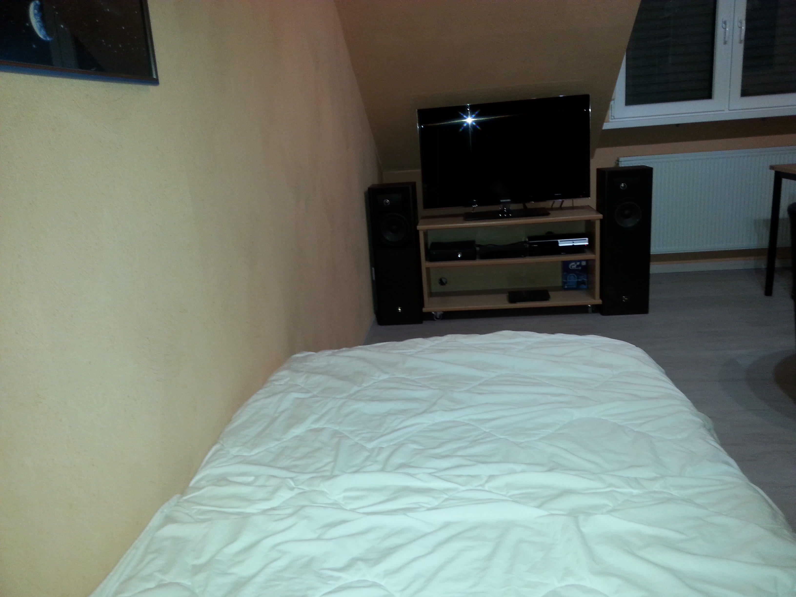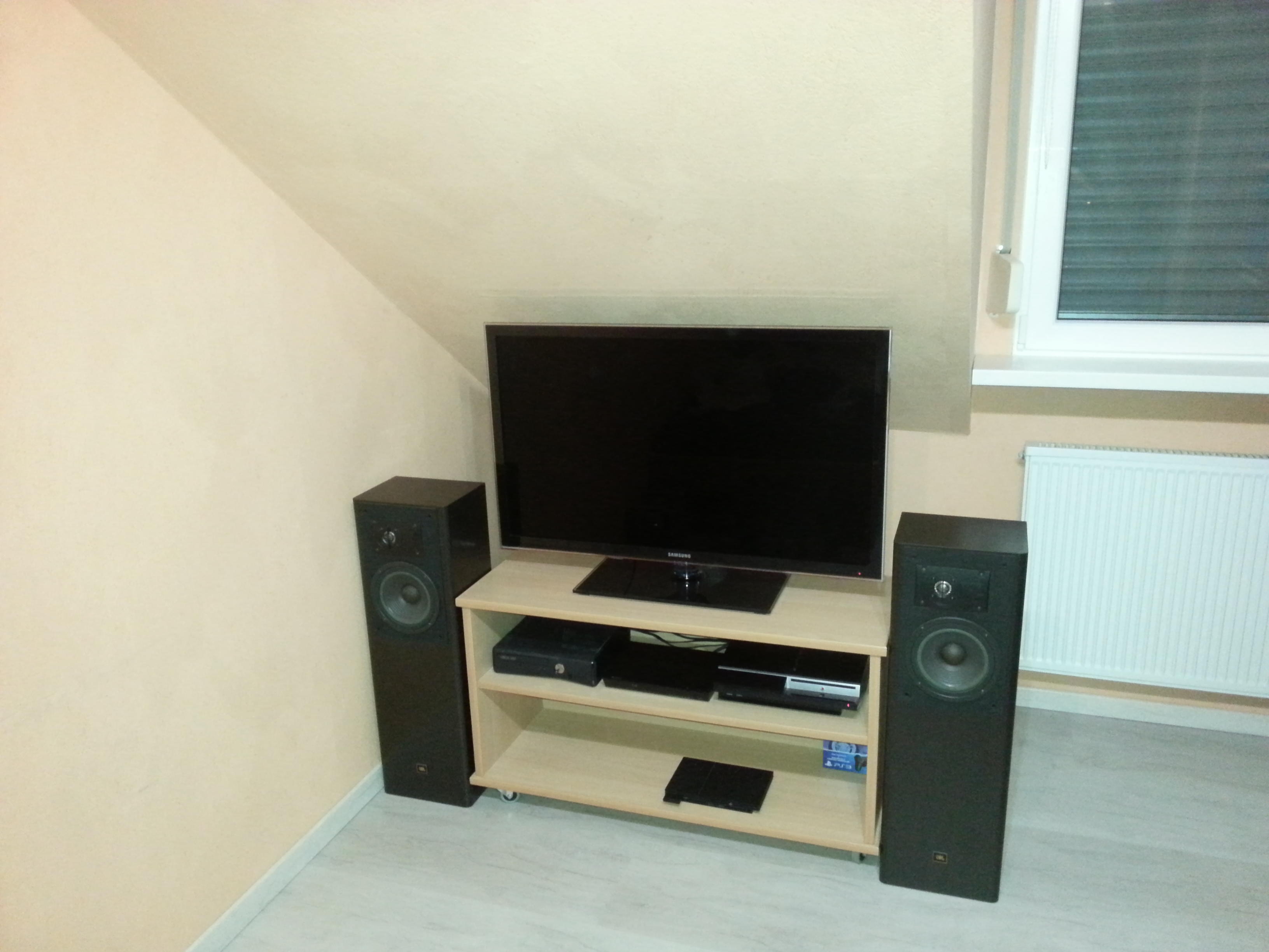 linke Lautsprecher direkt an der Wand, da erzeugt sehr viele frühe Reflexionen und so wandnah übersteuert oft den Tieftonbereich.