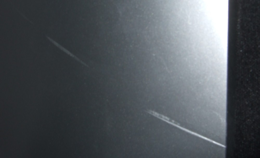 Dafür hat der Lautsprecher an der Seite einen 1-2 mm tiefen und 4cm langen Kratzer sowie an zwei Stellen leichtere Lackschäden ohne Vertiefung.