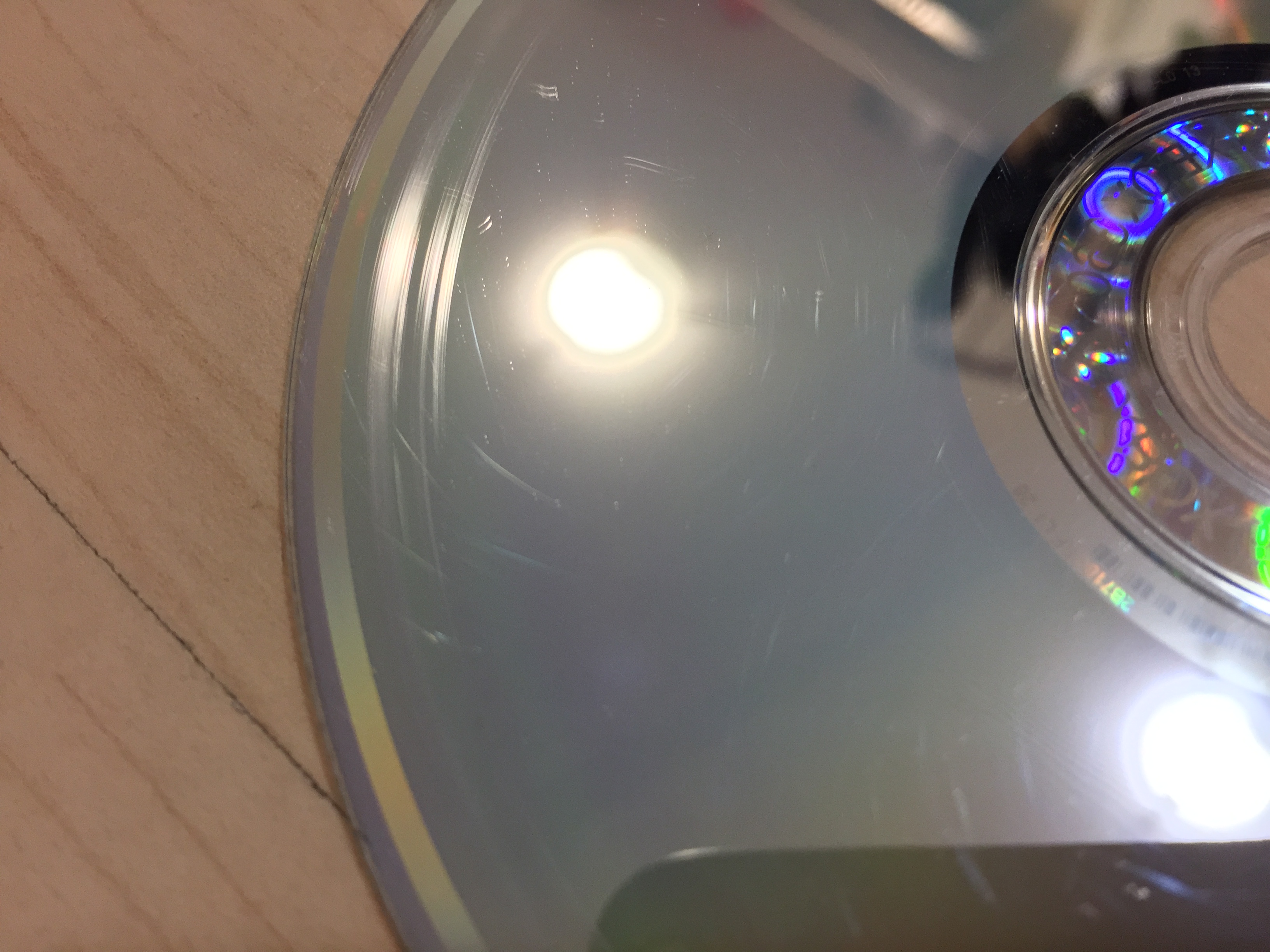 Ich hab hier eine Spiele CD/DVD von einer Xbox 360. Wie man auf den bildern erkennen kann, hat das defekte Laufwerk die CD ordentlich zerkratzt. Wenn man mit dem Fingernagel über die zerkratzte Stelle fährt, kann man die Rillen spüren.