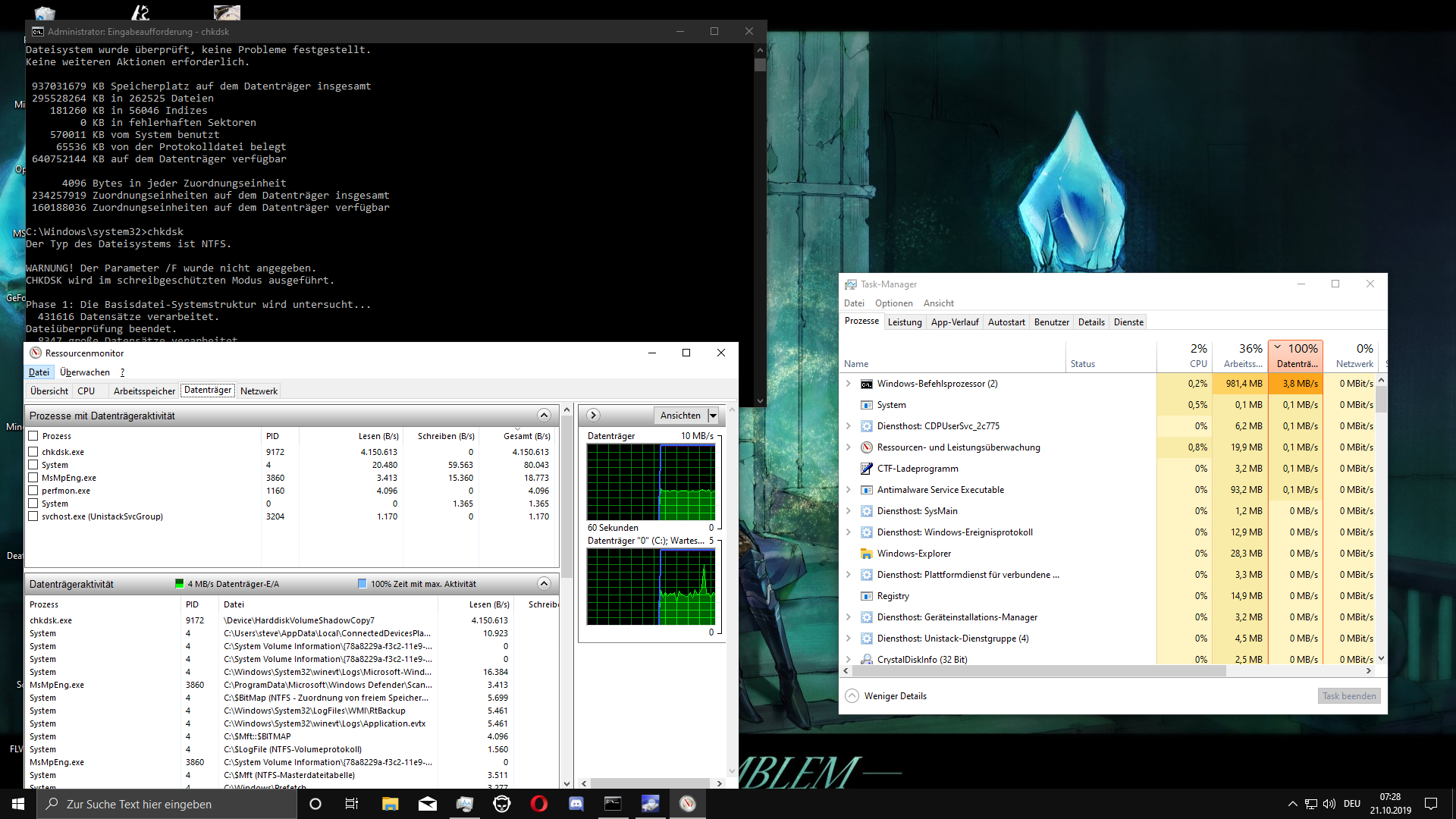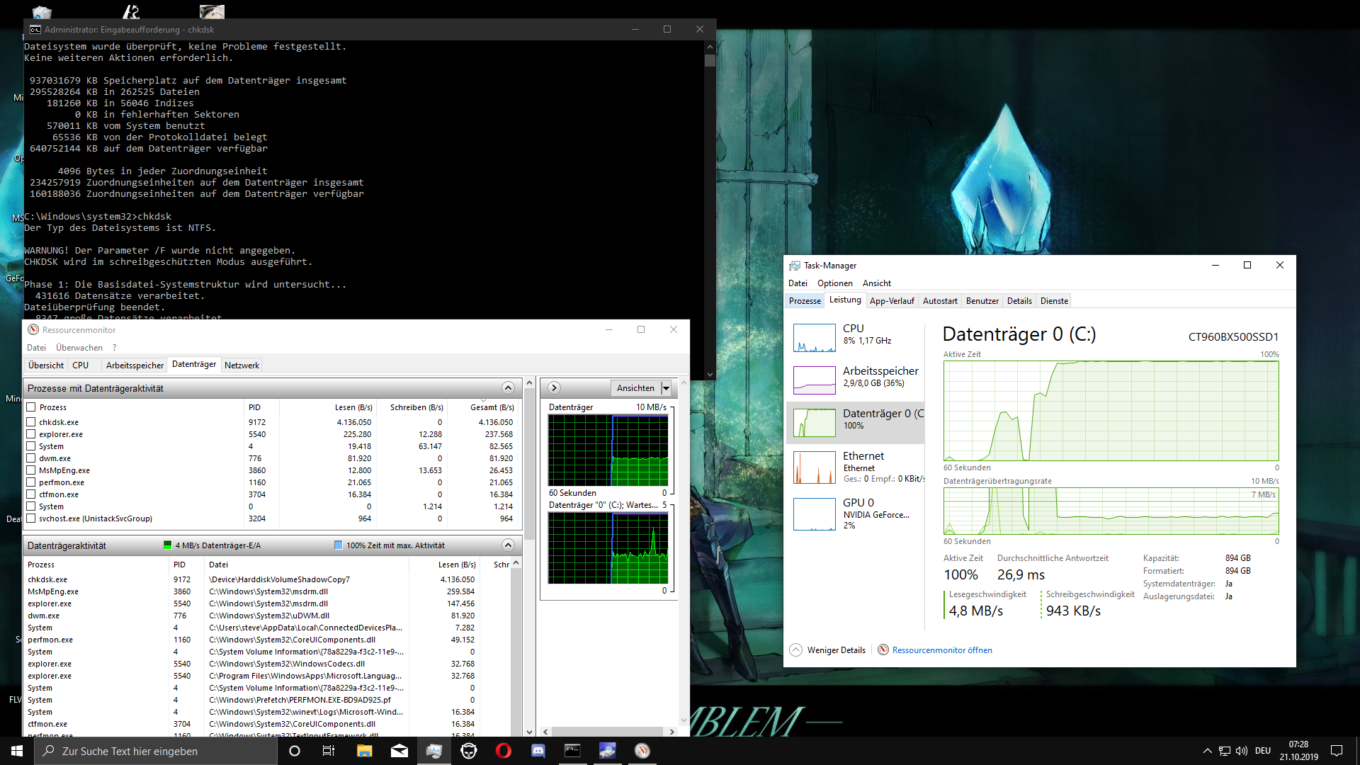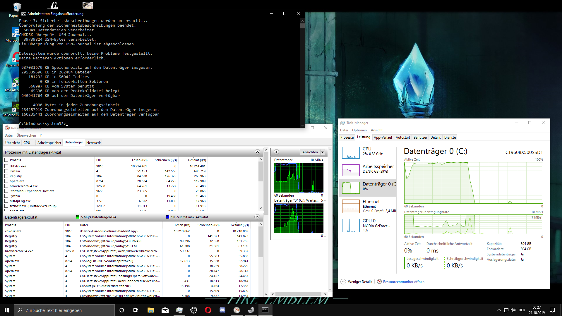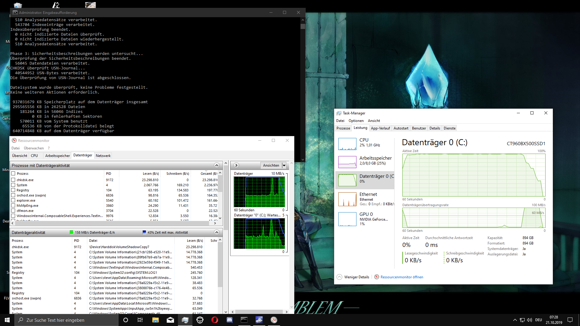 Oftmals, aber nicht immer, wenn ich beispielsweise ein Spiel öffne oder mich in einem Ladebildschirm befinde braucht mein System sehr lange, um besagte Tätigkeiten auszuführen. Wenn es mit normalem Tempo geht, sind es bei Code Vein zum Beispiel rund 8 Sekunden von Map A zu Map B, dauert es länger sind es 30+. Und wie ich gesehen habe liegt dies daran, dass die SSD zu diesem Zeitpunkt zu 100% ausgelastet ist, mit 4 MB/s read und <1 MB/s write. Auch bei dem chkdsk-Befehl in der Eingabeaufforderung habe ich das bemerkt. Manchmal geht der Test innerhalb von 10 Sekunden durch, manchmal erst in 2 Minuten. Selbiges passiert interessanterweise auch beim Booten, besonders beim Kaltstart. Oftmals braucht der PC eine Minute, um den "Asrock"-Bildschirm zu überwinden, manchmal nur 10 Sekunden.