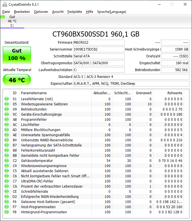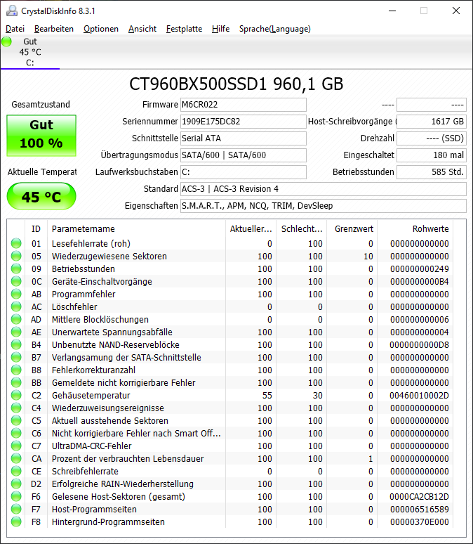Stelle bitte bei CrystalDiskInfo die Anzeige der Rohwerte wieder auch hexadezimal, mit der aktuellen Anzeige kann man nicht viel anfangen. Da es eine DRAM less SSD ist, stören andere Zugriffe wie die des Defender die Performance gewaltig, denn dann muss ja immer wieder ein anderer Teil der Mappingtabelle aus dem NAND nachgeladen werden, bevor überhaupt die Zugriffe auf die eigentlichen Daten erfolgen können. Man sieht ja auch, dass die Übertragungsraten höher werden, wenn die Auslastung fällt, genau wie bei HDDs eben auch.