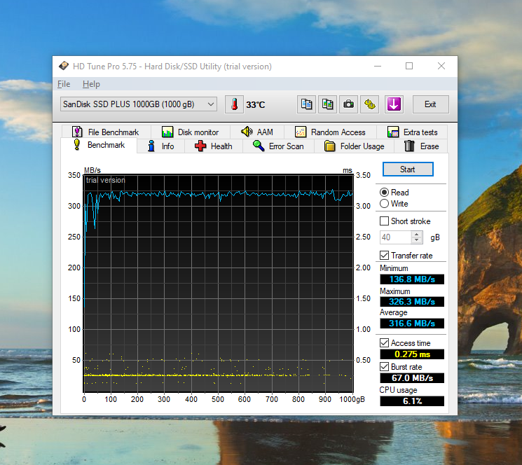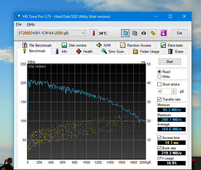http://www.hdtune.com/download.html (Screen "Benchmark"; durchlaufen lassen!) .