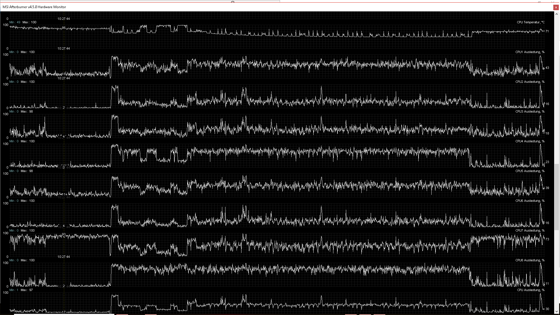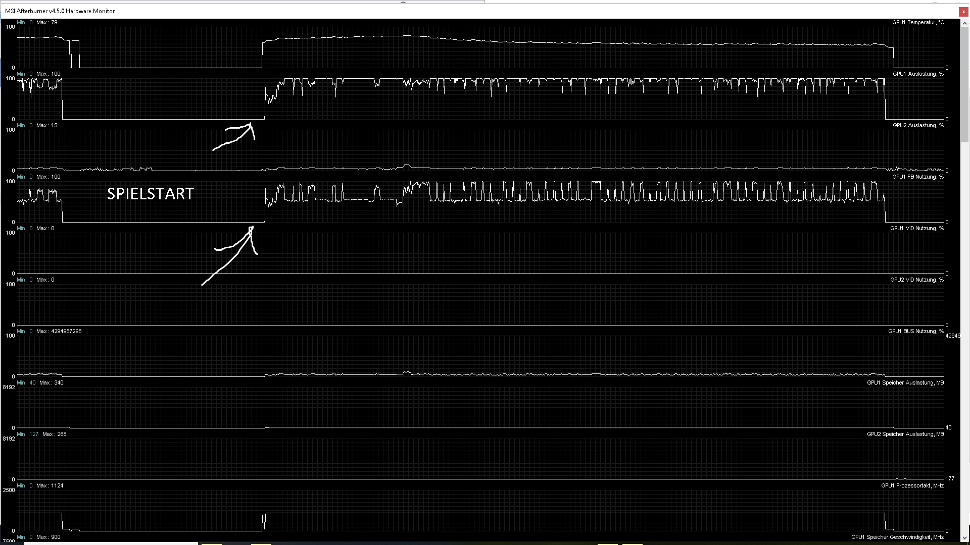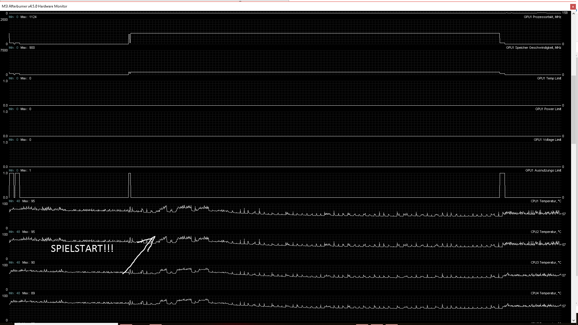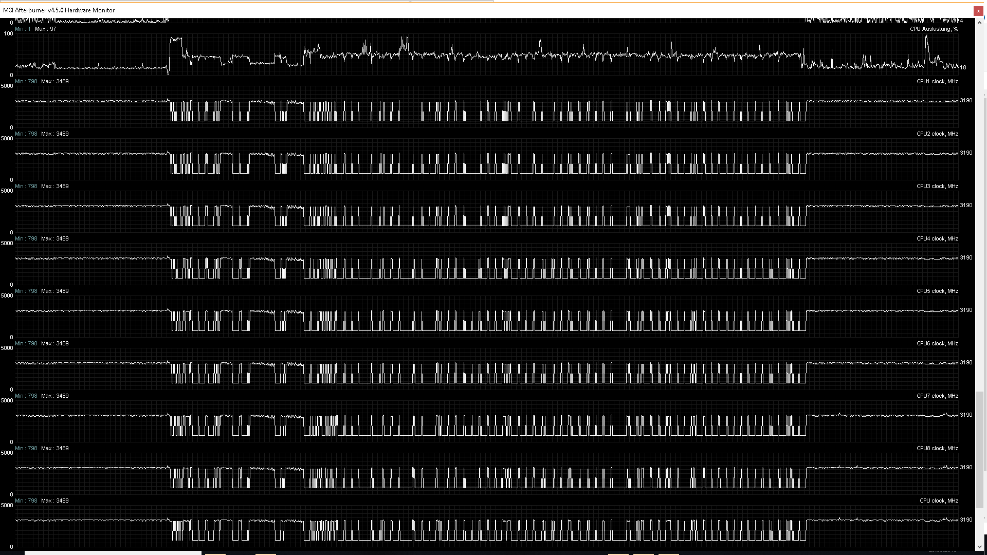 Ich habe mal Screenshots von den Graphen von MSI Afterburner gemacht, so dass ihr euch ein Bild davon machen könnt ... auffällig ist hier die Prozessortaktung, welche zwischen 3290 und 798 in einem bestimmten Intervall springt - ich habe wirklich keine Ahnung was los ist aber die Einbrüche und Schwankungen sind ersichtlich ...