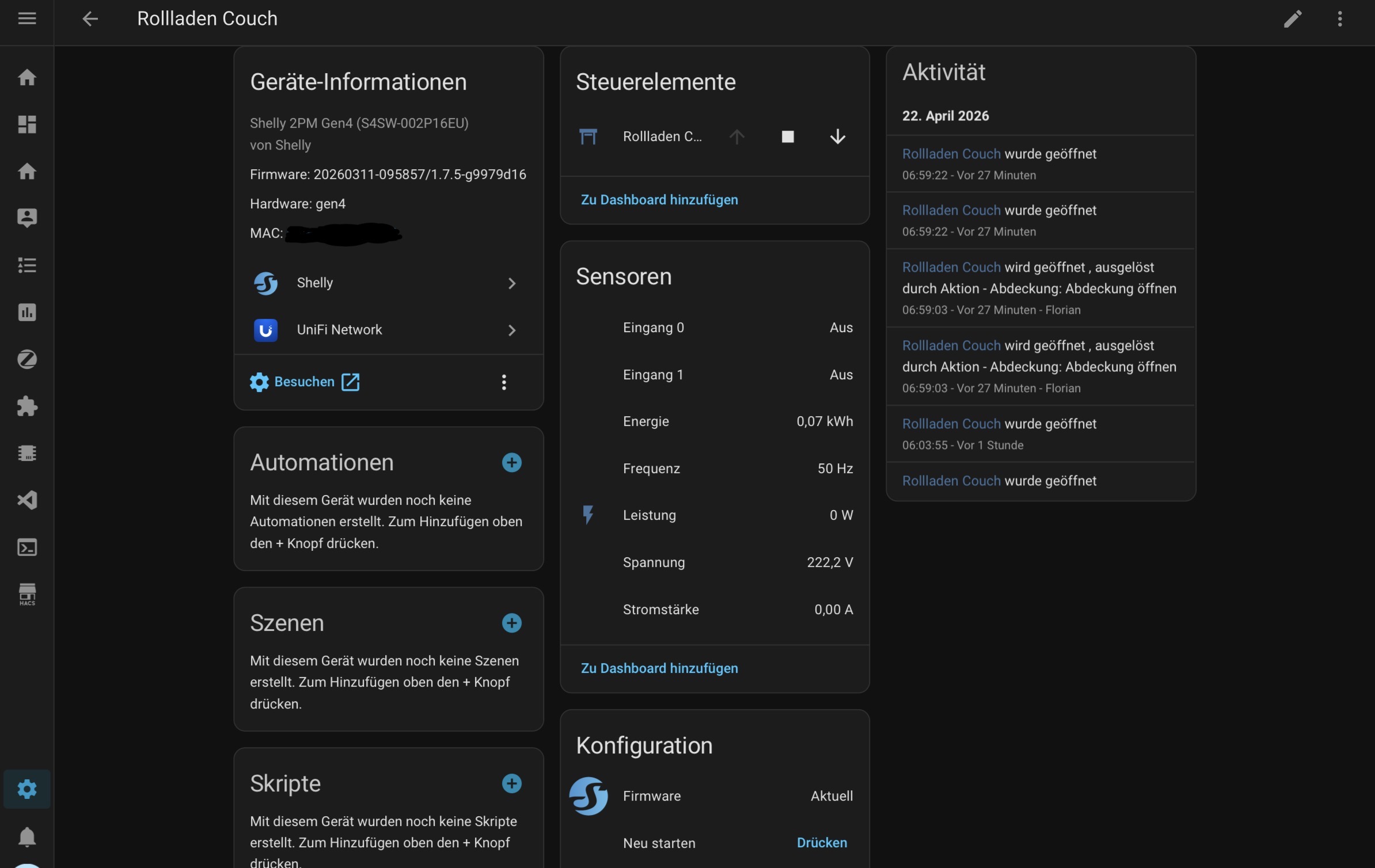 Was mir in diesem Prozess noch nicht wirklich klar ist - wieso sehe ich hier in HA nicht die Möglichkeit, den Rolladen hoch oder runter zu fahren? Dazu muss ich aktuell die beigelegte Fernbedienung nutzen.. aber das müsste doch auch direkt in HA gehen?