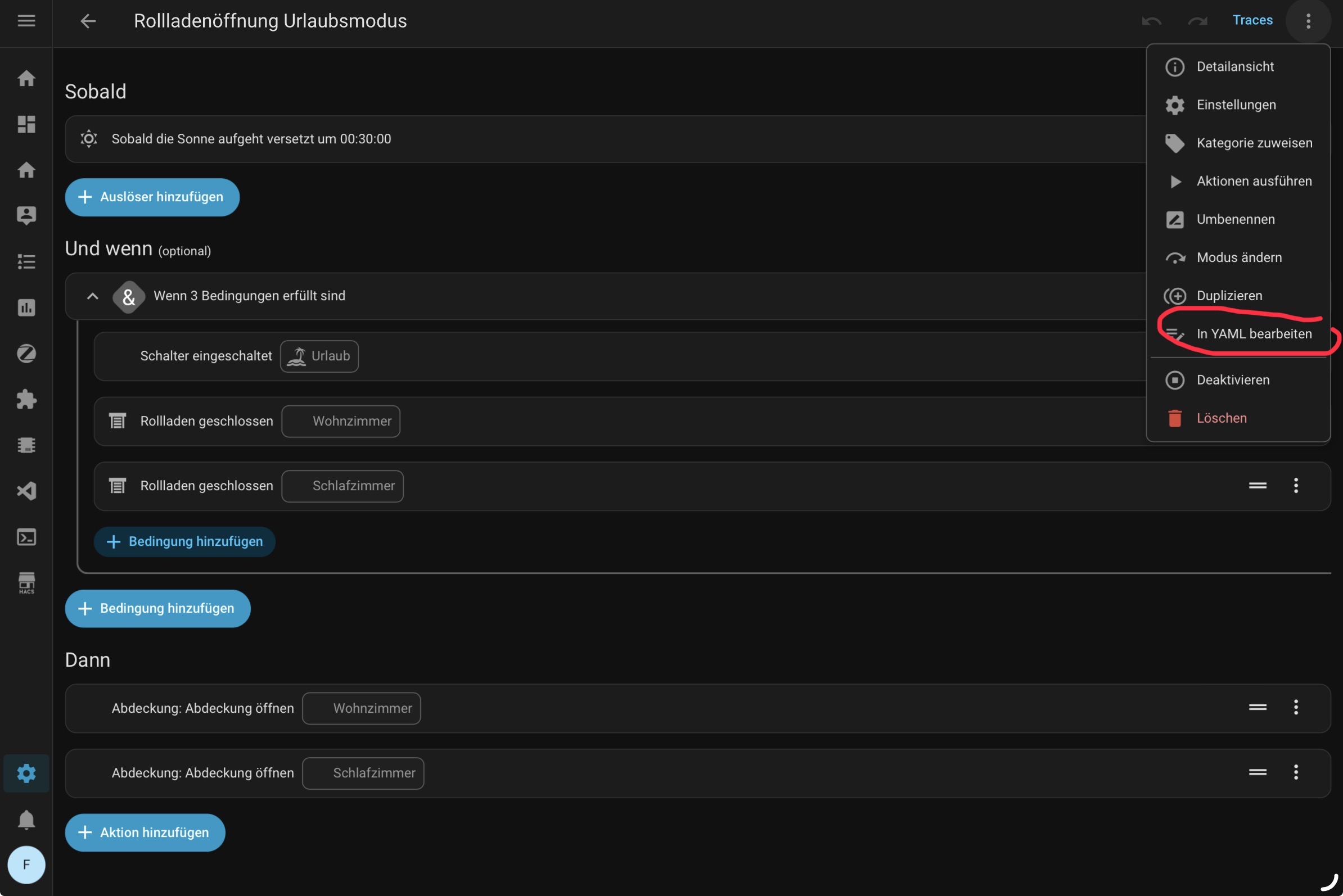 Unter "Neue Automation", kann ich als "Auslöser" einen Zeitpunkt einrichten.. folglich müsste dann unter "Dann" eine "Aktion" hinzugefügt werden, nämlich das Öffnen des Rolladens. Nur wo finde ich diese Aktion? Da hänge ich gerade etwas..