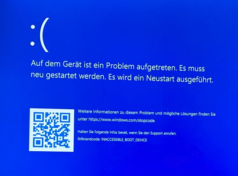 Beim Start wird Windows ganz normal geladen und direkt vor Erscheinen des Startbildschirms kommt eine Fehlermeldung: Inaccessible Boot Device.