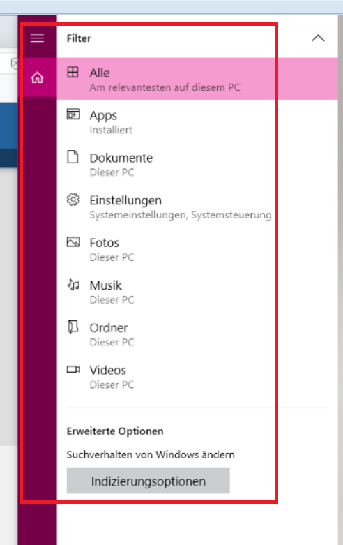 Die Einstellungen sind jedoch so eingestellt, das alle Inhalte (Apps, Dateien etc.) durchsucht werden soll.