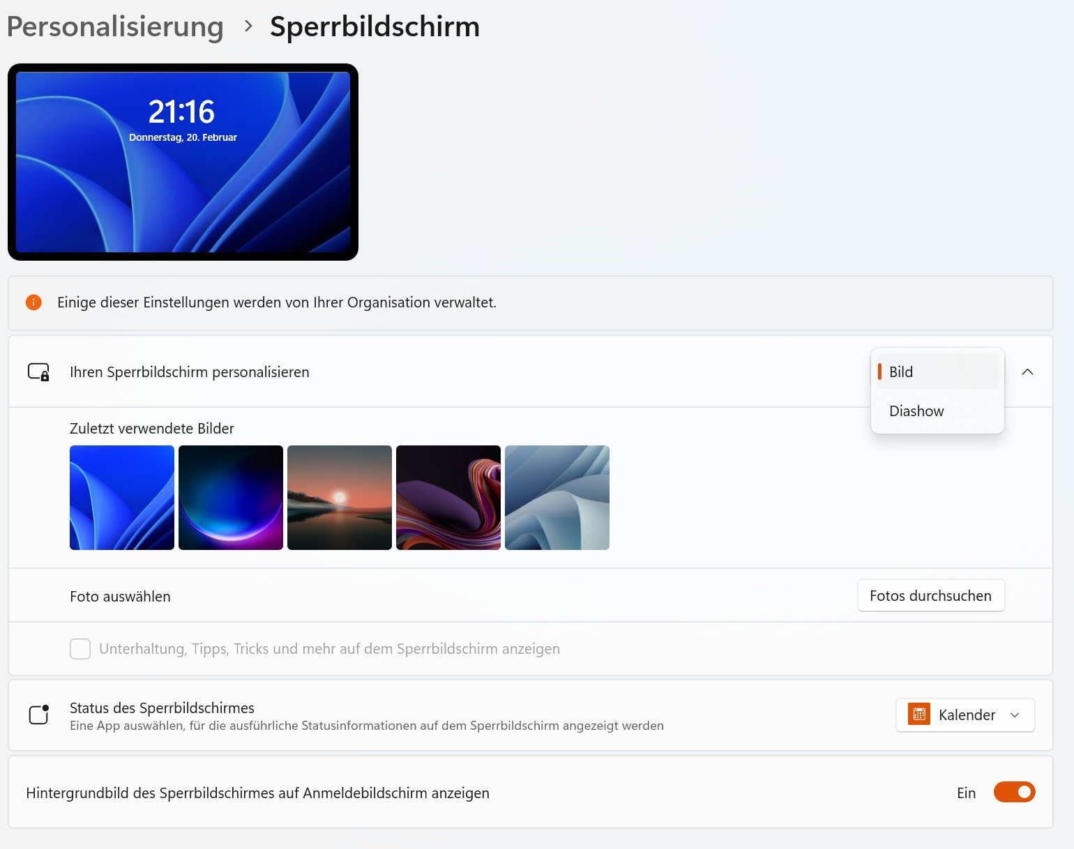 Auch habe ich bemerkt, dass unter Personalisierung - Sperrbildschirm, ich Windows Spotlight für den Sperrbildschirm mehr einstellen kann (Einige dieser Einstellungen werden von ihrer Organisation verwaltet). Gruppenrichtlinien wurden aber keine konfiguriert und ich bin als Administrator auf meinem privaten Konto angemeldet.