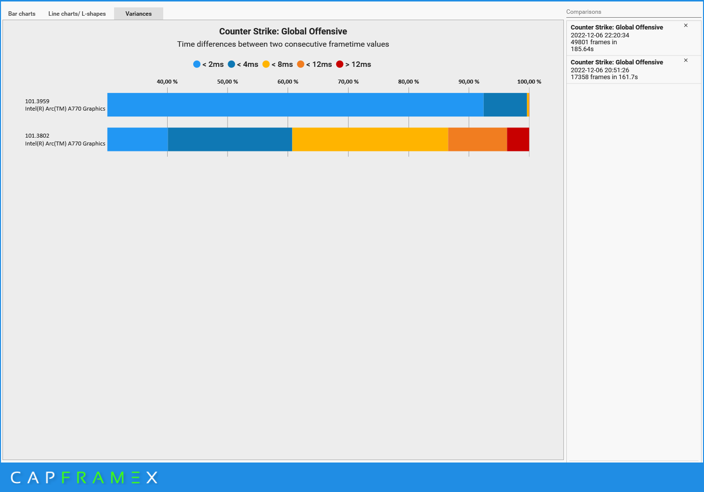 Starcraft 2: Mit dem älteren Treiber war das Spiel ziemlich hakelig - generell keine tollen fps und dann immer wieder Hänger. Benchmark war die Anfangssequenz der Coop-Map "Left2Die" - eine Map aus der Kampagne umgebaut für 2 Spieler. Die Map startet mit einem Intro-Fly-Over, was sehr konsistent ist. 0,2% Percentile steigen um 23% und 2% Percentile um 11,5%. Das Spielgefühl verbessert sich deutlich, aber die A770 ist trotzdem keine besonders gute Karte für SC2.