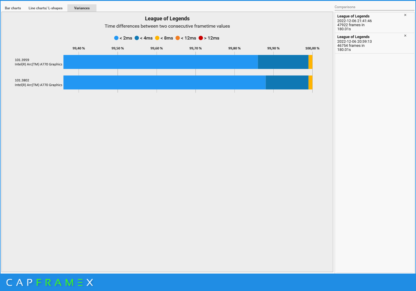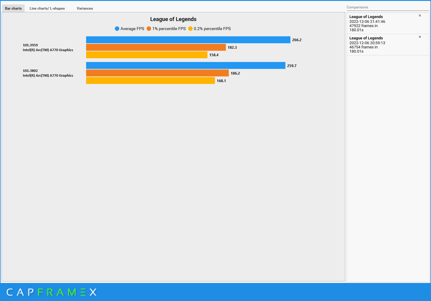 Ich merke hier garkeinen Unterschied zu meiner 5700XT. Ich cappe normalerweise das Spiel auf 165 fps via Rivatuner für Adaptive Sync und da bleiben die FPS immer drüber. Hier gibts nichts zu sehen - die AVG gehen etwas hoch, die MIN etwas runter - könnte aber auch eine Lauf-Lauf Varianz sein - die ist in League nämlich trotz Replay ziemlich hoch. Je länger das Spiel läuft, desto weiter sinkt geringfügig die Leistung (egal mit welcher GPU). Ich würde sagen hier hat sich unterm Strich nichts geändert.