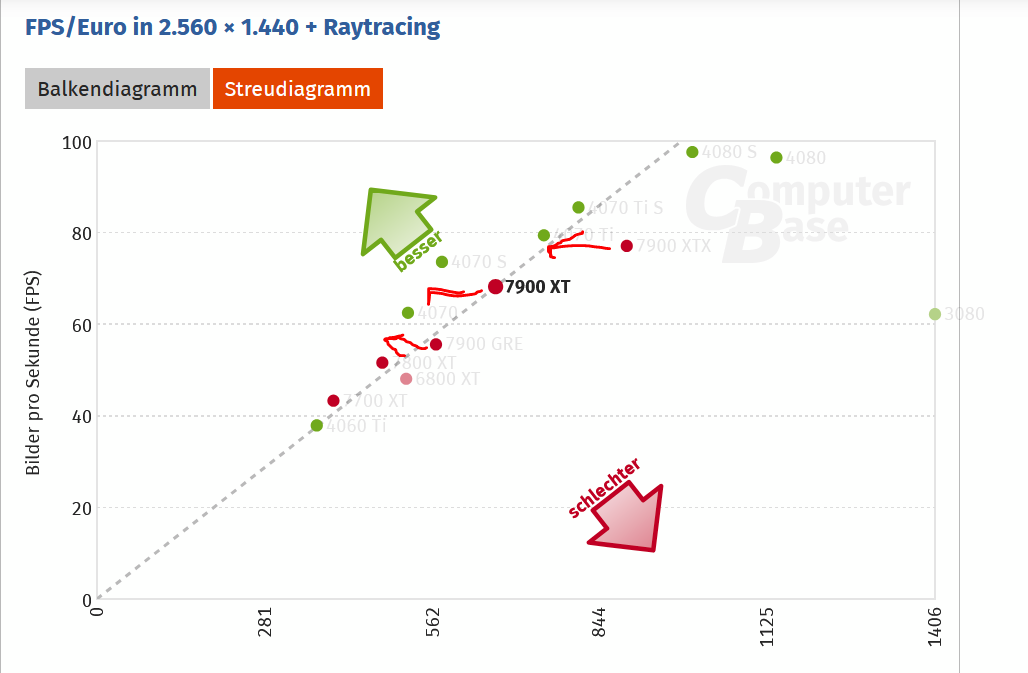 Im Balkendiagramm bedeutet es einfach, dass die 7900-er Karten oberhalb bzw. die XTX gleich auf mit der der RTX 4070 TI super liegen müssen, stattdessen liegt die GRE 8 Prozent dahinter, die XT 4 Prozent und die XTX noch weiter weg. Wobei bei diesem P/L-Diagramm der letzte Preisverfall der XTX noch nicht berücksichtig ist. Die wird inzwischen sich besser platzieren können.