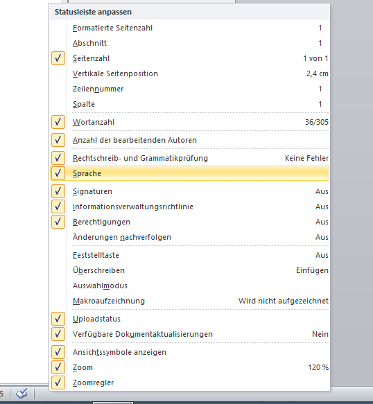 ich bin vor kurzem umgestiegen von Windows 7 auf Windows 8.1. Seitdem sehe ich im Word links unten nicht mehr welche Sprache gerade bei der Rechtschreibprüfung ausgewählt ist. Das Häkchen für die Sprache ist gesetzt.