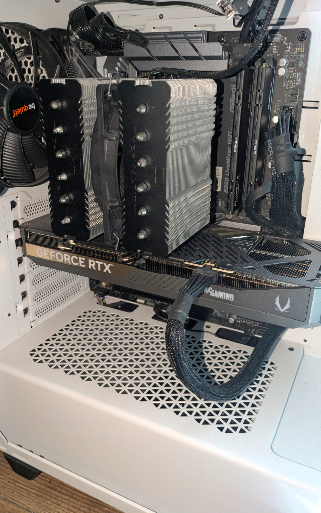 Ein Doppel-Tower-CPU-Kühler mit 8mm heat-pipes und 12 und 14cm Lüftern auf einem 7600X3D der (im BIOS/UEFI) thermisch auf 75 Grad und elektrisch auf 45 Watt (package) reduziert (und gut undervolted) ist, und eine low-profile RTX 4060 die thermisch auf 76 Grad (das ist das Minimum) und elektisch auf 86 Watt (auch das Minimum, das ändert sich von Treiber zu Treiber mal) mit Afterburner reduziert und auch gut undervolted ist. Das alles hat weniger Leistung gedrosselt als ich am Anfang angenommen habe. Von Spiel zu Spiel sind das vielleicht maximal 5 bis 10% der frames im Vergleich zu den 120 bis 130W TDP die die Grafikkarte sonst saugt.