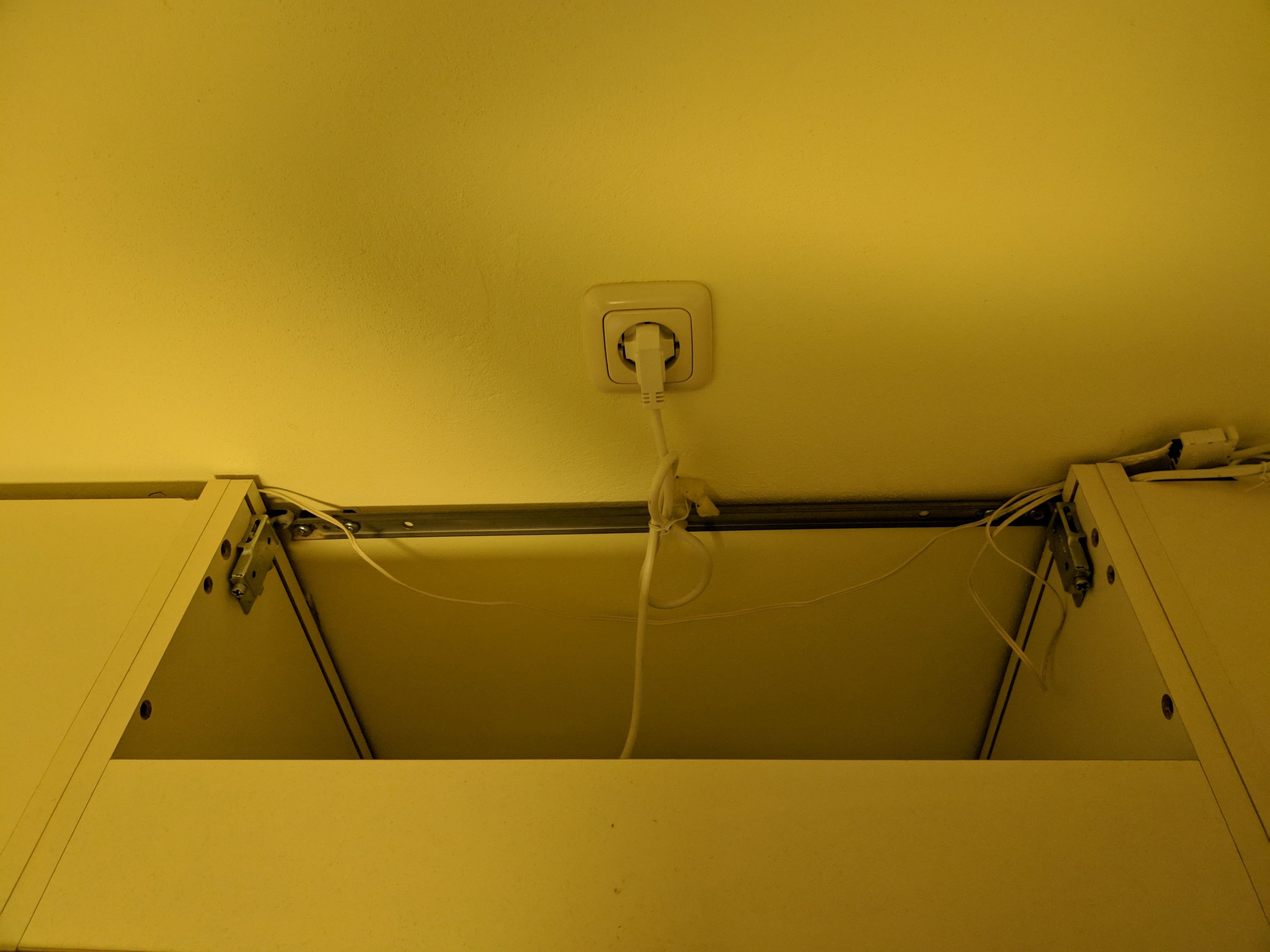 Das Innenmaß beträgt 57 cm x 22 cm. Ich habe mir wie gesagt vorgestellt, auf diese Öffnung einen Staubfilter aufzulegen, der mit magnetischen Rändern auf den Hängeschränken seine Position behält. Ich weiß, dass es solche vorgefertigten Staubfilter gibt, die man vor die Lüfter (bzw. dem Netzteil) anbringt und dort auch magnetisch haften bleiben; jedoch ist mein Maß etwas unkonventionell, um mit meinen Spezifika mitzuhalten.
