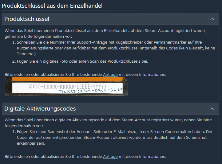 Weiter wurden von dem Steam Account alle Spiele nur mit Guthaben-Karten bezahlt und diese (aus eigener Unwissenheit um deren Wichtigkeit) immer entsorgt so das ich keine Zahlungsnachweise im Sinne von Steam beibringen kann.