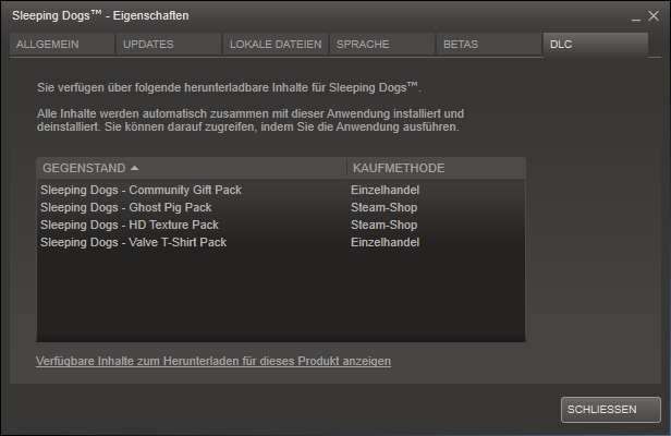Unter Sleeping Dogs -> Eigenschaften -> DLC steht dann hinter dem Jeweiligen eurer Wahl Steam-Shop als "Kaufmethode" (ist beides gratis).