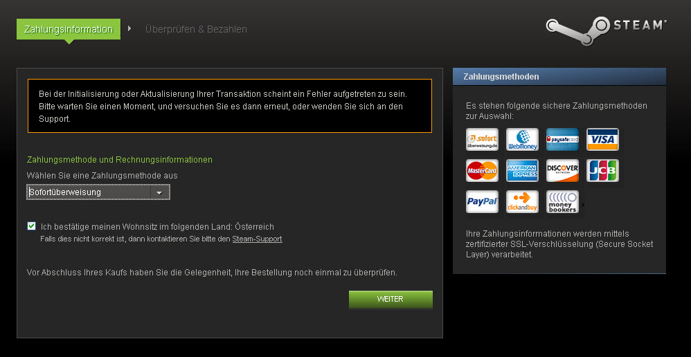 Ich habe jetzt schon zum dritten Mal hintereinander nicht die Möglichkeit bei einer Steam-Aktion etwas zu erwerben. Andauernd bekomme ich folgende Fehlermeldung: "Bei der Initialisierung oder Aktualisierung Ihrer Transaktion scheint ein Fehler aufgetreten zu sein. Bitte warten Sie einen Moment, und versuchen Sie es dann erneut, oder wenden Sie sich an den Support." Siehe auch Screen anbei.